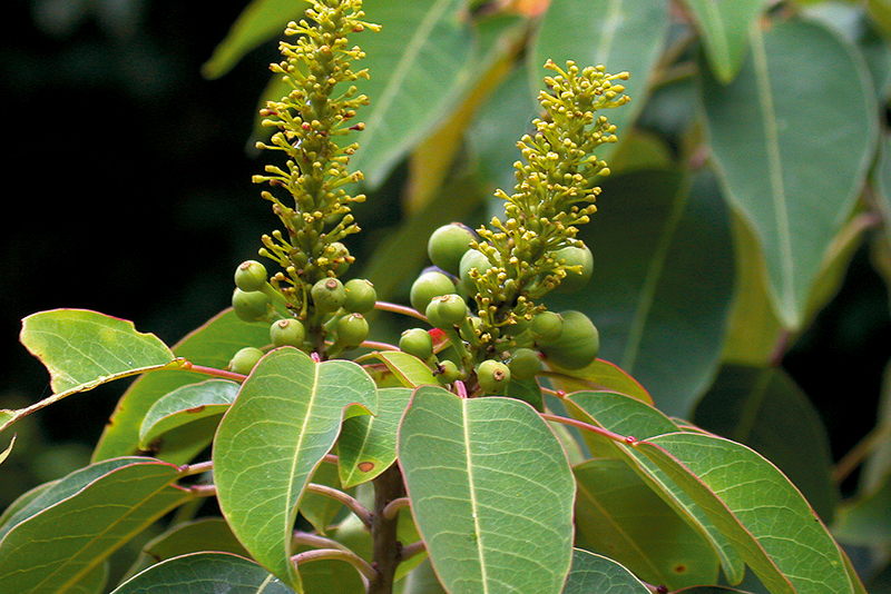 ตาตุ่มตรี: โคนใบด้านบนมีต่อม 2 ต่อม ช่อดอกแบบช่อกระจุกแยกแขนงสั้น ๆ คล้ายช่อเชิงลด ออกที่ปลายกิ่ง ดอกเพศเมียอยู่โคนช่อ (ภาพ: สุคนธ์ทิพย์ ศิริมงคล, ราชันย์ ภู่มา)
