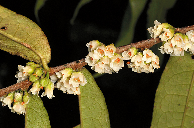 ปลายสาน: ตาที่ยอดมีขนยาว ปลายใบแหลมยาวหรือยาวคล้ายหาง ดอกออกเป็นกระจุก 1–3 ดอก ก้านเกสรเพศเมียแยก 3 แฉก ติดทน (ภาพ: ราชันย์ ภู่มา, สุคิด เรืองเรื่อ)