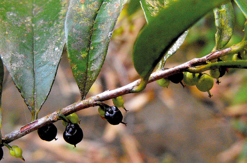 ไม้พุ่มหรือไม้ต้น สูงได้ถึง 15 ม. ตาที่ยอดมีขนยาว มีขนสั้ันนุ่มตามก้านใบ แผ่นใบด้านล่าง ก้านดอก และกลีบเลี้ยงด้านนอก ใบรูปขอบขนาน รูปใบหอก หรือแกมรูปไข่ ยาว 4.5–9 ซม. ปลายแหลมยาวหรือยาวคล้ายหาง ก้านใบยาว 1–6 มม. ดอกออกเป็นกระจุก 1–3 ดอก ก้านดอกยาว 2–3 มม. กลีบเลี้ยงรูปรีกว้าง ยาว 1–2 มม. กลีบดอกรูปไข่กลับ ยาว 2.5–4 มม. เกสรเพศผู้มี 15–20 อัน รังไข่มี 3 ช่อง เกลี้ยง ก้านเกสรเพศเมียยาว 2–3 มม. แยก 3 แฉก ผลกลม เส้นผ่านศูนย์กลาง 4–5 มม.พบที่อินเดีย ภูฏาน เนปาล ศรีลังกา พม่า จีนตอนใต้ เวียดนาม คาบสมุทรมลายู สุมาตรา และชวา ในไทยพบทุกภาค ขึ้นตามป่าดิบแล้ง และป่าดิบเขา ความสูงถึงประมาณ 2100 เมตร ใบเคี้ยวบรรเทาอาการไอ แก้ปวดท้อง ท้องเสีย และบิด