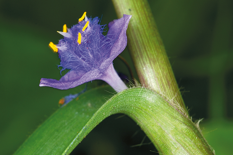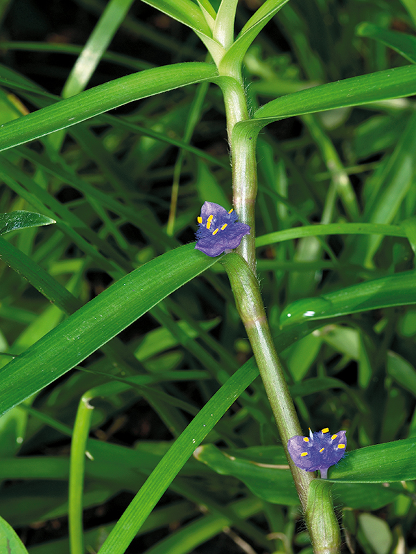 ไม้ล้มลุก สูง 30–40 ซม. แตกแขนงใกล้โคนแผ่กว้าง เกลี้ยงหรือมีขนด้านเดียว กาบหุ้มลำต้น 0.5–1.2 ซม. มีขนยาวกระจาย ใบเรียงสลับระนาบเดียวหรือเรียงเวียน รูปแถบ ส่วนมากยาว 2–8 ซม. โคนเรียวจรดกาบใบ ขอบใบมีขนสาก แผ่นใบมีขนครุยด้านล่าง ช่อดอกอยู่ภายในกาบ ลดรูปเป็นกระจุก 3–8 ดอก บานทีละดอก ใบประดับย่อยบางใส ยาวประมาณ 1 ซม. กลีบเลี้ยง 3 กลีบ รูปใบพาย ยาว 6–9 มม. ด้านนอกมีขนหยาบ กลีบดอก 3 กลีบ สีฟ้าอมม่วงหรือขาว กลางกลีบเชื่อมติดกัน หลอดกลีบดอกยาว 0.8–1 ซม. กลีบรูปไข่กว้าง ยาว 4–6 มม. เกสรเพศผู้ 6 อัน ก้านชูอับเรณูยาว 1–1.5 ซม. มีขนเครา อับเรณูสีเหลือง ก้านเกสรเพศเมียรูปเส้นด้าย ยาวประมาณ 1 ซม. ผลแห้งแตกเป็น 3 ซีก รูปรี แบน ยาว 4–7 มม. ปลายมีเขา 6 อัน มี 1–2 เมล็ด รูปรี ยาวประมาณ 2 มม. สีดำ มีรอยบุ๋มกระจาย