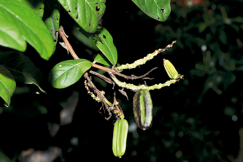 พู่อมร: ช่อดอกคล้ายช่อเชิงลด หลอดกลีบเลี้ยงคอดปลาย เกสรเพศผู้ 10 อัน เรียง 2 วง ผลแห้งไม่แตกรูปรี มีห้าเหลี่ยม ไร้ก้าน (ภาพ: ราชันย์ ภู่มา)