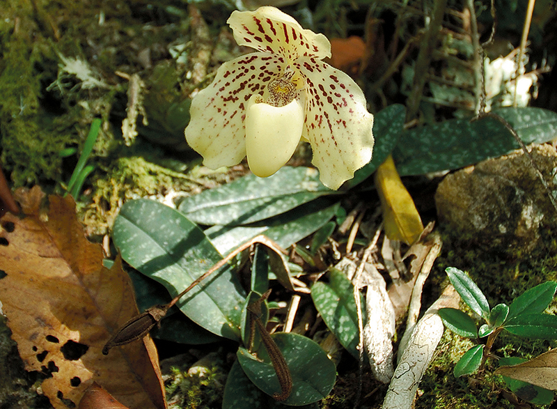 | | รองเท้านารีเหลืองตรัง: ถิ่นที่อยู่บนหินปูน ดอกสีขาวอมเหลือง มีจุดสีม่วงกระจาย กลีบเลี้ยงบนรูปไข่กว้าง