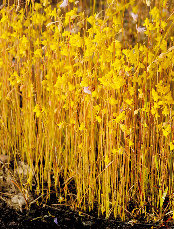 ไม้ล้มลุก ใบออกจากไหล รูปแถบ ยาวได้ถึง 2 ซม. กับดักแมลงเป็นกระเปาะกลม ติดบนไหลและใบ ยาวประมาณ 1 มม. ช่อดอกออกเดี่ยว ๆ แบบช่อกระจะตั้งตรง เกลี้ยง สูงได้ถึง 60 ซม. มี 1–10 ดอก ใบประดับและใบประดับย่อยติดที่โคน ก้านดอกยาว 2–5 มม. มีปีกแคบ ๆ กลีบเลี้ยงแฉกลึกรูปไข่ ยาว 2–7 มม. ดอกสีเหลือง ยาว 0.6–1 ซม. เดือยรูปลิ่ม ยาว 3–7 มม. ก้านชูอับเรณูยาวประมาณ 1 มม. ผลรูปรี ยาวประมาณ 3 มม. ก้านผลพับงอ เมล็ดมีลายร่างแห
