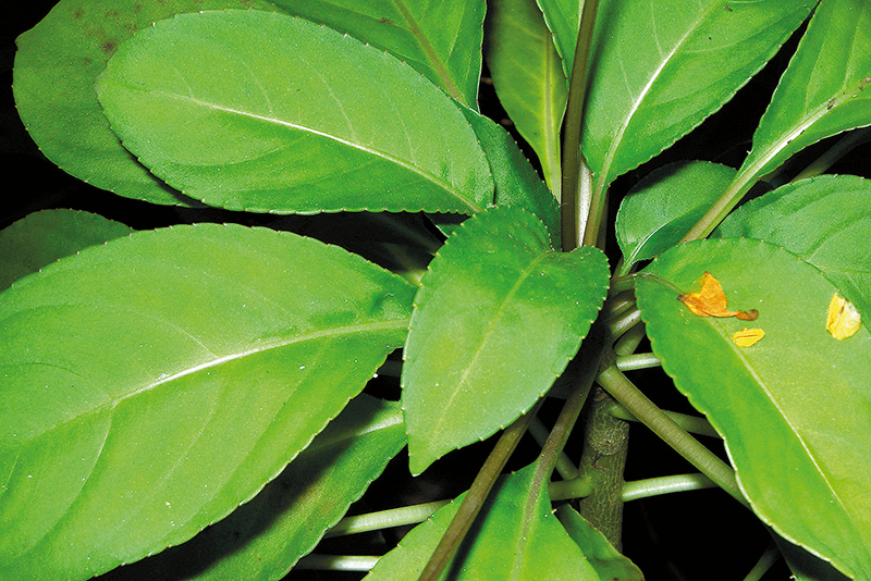 ไม้ล้มลุก ลำต้นอวบน้ำ สูงได้ถึง 1 ม. ใบเรียงเวียนหนาแน่นที่ปลายยอด รูปรีถึงรูปใบหอก หรือแกมรูปไข่ ยาว 6–12 ซม. ปลายแหลม โคนสอบเรียว แผ่นใบหนา ขอบจักฟันเลื่อย ก้านใบยาว 1–5 ซม. ช่อดอกออกตามซอกใบใกล้ปลายกิ่ง ยาวได้ถึง 15 ซม. บางครั้งแตกช่อย่อย ก้านดอกยาว 0.5–1.5 ซม. ใบประดับรูปไข่กว้าง ยาว 4–5 มม. ร่วงช้า ดอกสีเหลือง กลีบเลี้ยง 4 กลีบ คู่นอกรูปไข่กว้าง ยาว 6–8 มม. ปลายมีติ่งแหลม คู่ในรูปแถบ ยาว 2–4 มม. กลีบปากเป็นถุง กว้างและยาวประมาณ 1 ซม. เดือยยาว 1–1.5 ซม. ปลายม้วนงอ กลีบดอกกลีบกลางรูปไข่กว้าง ยาวประมาณ 1 ซม. มีสันเรียวจรดโคน กลีบปีกยาว 1.2–2 ซม. ติดกัน กลีบคู่นอกยาวกว่ากลีบคู่ใน ปลายแฉกลึก ผลรูปกระบอง เกลี้ยง ยาวประมาณ 2 ซม. (ดูข้อมูลเพิ่มเติมที่ เทียน, สกุล)