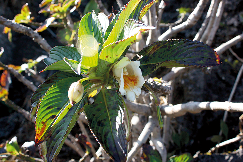 ไม้ล้มลุก ลำต้นอวบน้ำ แตกกิ่งหนาแน่น สูงได้ถึง 1 ม. ใบเรียงเวียนหนาแน่นที่ปลายยอด รูปใบหอกแกมรูปไข่ ยาว 6–11 ซม. ปลายแหลมยาว โคนรูปลิ่มหรือรูปลิ่มกว้าง แผ่นใบหนา ขอบจักฟันเลื่อย ปลายมีต่อม โคนใบมีต่อม 1 คู่ ก้านใบยาว 1–3 ซม. ดอกออกเดี่ยว ๆ หรือเป็นคู่ตามซอกใบ ใบประดับรูปแถบ ยาวประมาณ 5 มม. ก้านดอกยาว 4–10 ซม. ดอกสีเหลืองอ่อน สีครีม หรืออมชมพู โคนด้านในกลีบล่างมีปื้นเป็นริ้วสีเหลืองหรือแดง กลีบเลี้ยงคู่นอกรูปไข่กว้าง ยาว 1.5–2 ซม. ปลายมีติ่งแหลม คู่ในฝ่อ กลีบปากเป็นถุงกว้าง กว้าง 2–2.5 ซม. เดือยรูปตะขอ ยาวประมาณ 5 มม. แยก 2 พู กลีบกลางรูปรีแกมรูปไข่กลับ ยาว 1.5–2 ซม. ปลายเว้าตื้น กลีบปีกคู่นอกและคู่ในยาวเท่า ๆ กัน ยาวได้ถึง 3.5 ซม. ผลรูปกระสวย เต่งกลาง ยาวได้ถึง 3 ซม. เมล็ดมีขนละเอียด (ดูข้อมูลเพิ่มเติมที่ เทียน, สกุล)