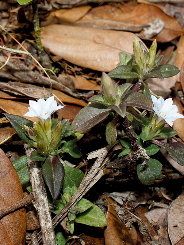 ดอกหรีด: ลำต้นสั้นทอดนอนหรือตั้งตรง แตกกิ่ง ใบเรียงรอบข้อชิดกันใกล้ปลายกิ่ง กลีบเลี้ยงรูปแถบหรือรูปใบหอก ยาวเท่า ๆ หลอดกลีบ กลีบดอกพับจีบจักชายครุย (ภาพ: สุคนธ์ทิพย์ ศิริมงคล)