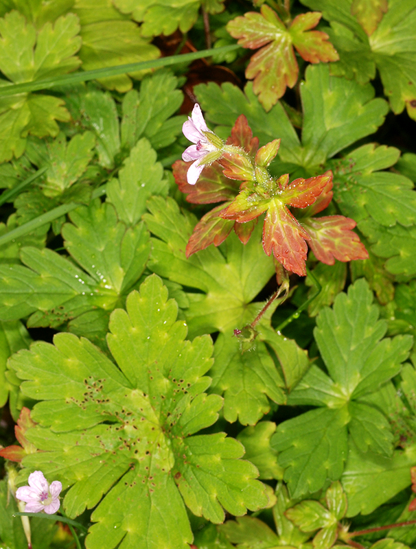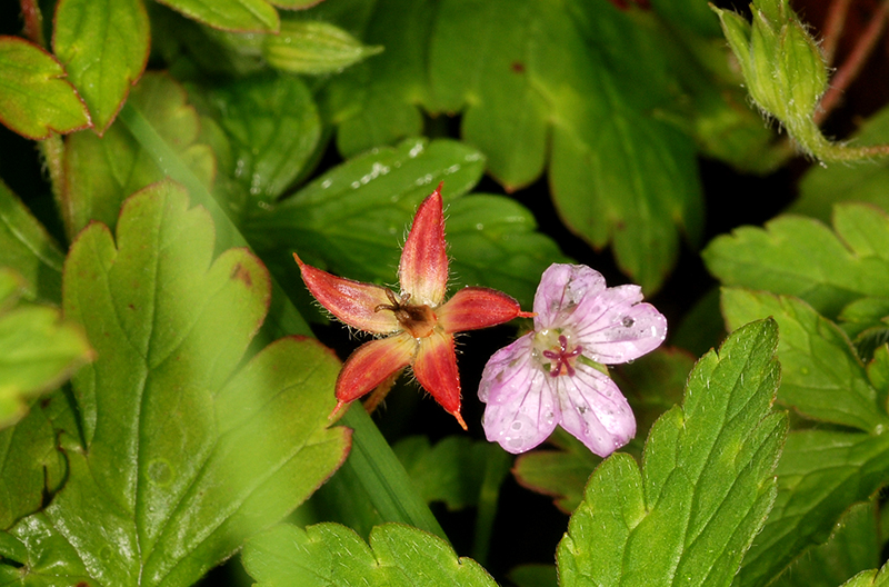 เจเรเนียมป่า: ใบรูปฝ่ามือมี 3–5 ส่วน กลีบดอกสีชมพูอ่อนหรืออมม่วง มีเส้นกลีบสีเข้ม แผ่นกลีบรูปขอบขนาน กลีบเลี้ยงติดทน (ภาพ: ราชันย์ ภู่มา)