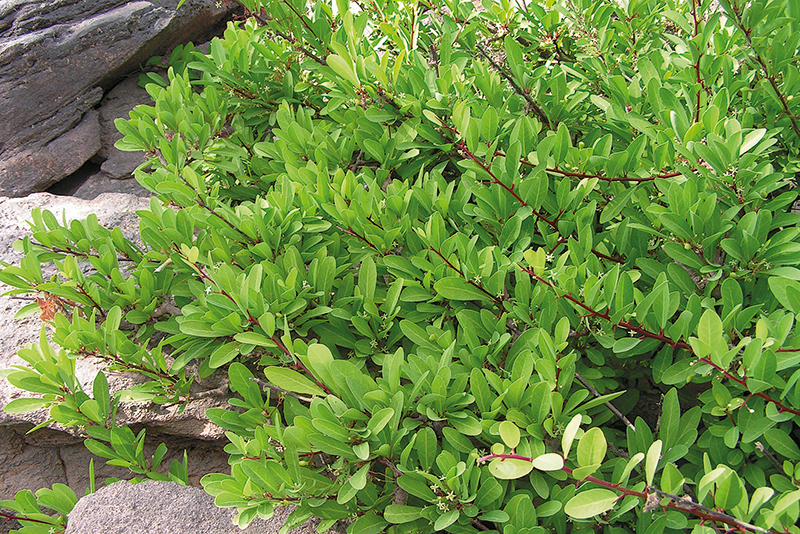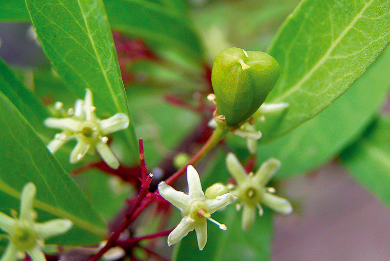 หนามก้านช้าง: ใบออกเป็นกระจุกตามกิ่งสั้น รูปไข่กลับหรือรูปใบหอกกลับ ดอกสีเขียวอมขาว เกสรเพศผู้ 5 อัน ติดบนขอบจานฐานดอก ผลรูปไข่กลับ (ภาพ: มนตรี ธนรส)