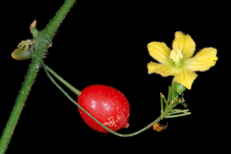 ไม้เถาล้มลุก แยกเพศร่วมต้น มือจับไม่แยกแขนง ลำต้นสาก ใบรูปสามเหลี่ยม รูปไข่ หรือรูปหัวใจ เรียบหรือจัก 3–5 พู ยาว 4–16 ซม. แผ่นใบด้านล่างสาก มีขนหยาบตามเส้นแขนงใบ ขอบเรียบหรือจักซี่ฟันห่าง ๆ ก้านใบยาว 1–5 ซม. มีขน ช่อดอกเพศผู้แบบช่อกระจะ มี 1–3 ช่อ ก้านช่อยาว 1.5–6 ซม. มีได้ถึง 25 ดอก มักมีดอกเพศเมียปนในช่อดอกเพศผู้ แกนช่อยาว 0.5–2 ซม. ก้านดอกยาว 2–7 มม. ฐานดอกสั้น มีขนหยาบ ปากมีขน กลีบเลี้ยง 5 กลีบ ยาวประมาณ 1 มม. ก้านชูอับเรณูยาวกว่าอับเรณู ยาว 1–1.5 มม. จานฐานดอกกลมแบน ดอกเพศเมีย 1–2 ดอก คล้ายดอกเพศผู้ ก้านดอกยาว 0.5–3 ซม. จานฐานดอกเป็นวง รังไข่มีขน เกสรเพศเมียมี 3 พู จักชายครุย ยาวประมาณ 2 มม. ผลสดมีหลายเมล็ด รูปรีหรือกลม ยาว 1–1.5 ซม. สุกสีแดง เมล็ดรูปไข่ แบน ยาว 3–6 มม. ผิวเป็นร่อง