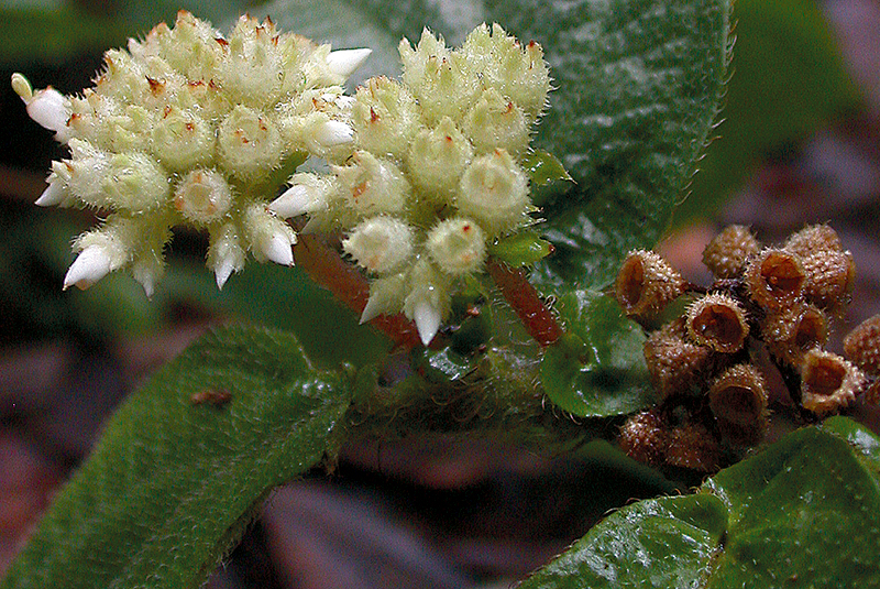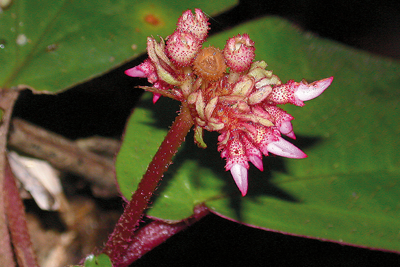 ไม้ล้มลุก สูงได้ถึง 20 ซม. มีขนยาวหนาแน่นตามกิ่ง ก้านใบ ขอบใบและแผ่นใบด้านล่าง และก้านช่อดอก มีขนคายและตุ่มกระจายบนฐานดอก และผล ใบเรียงหนาแน่นที่ยอด ใบตรงข้ามขนาดไม่เท่ากัน ใบรูปไข่หรือรูปขอบขนาน ยาว 6–14 ซม. โคนรูปหัวใจเบี้ยว ขอบจักฟันเลื่อย มีขนครุย เส้นโคนใบข้างละ 2–3 เส้น ก้านใบยาว 1.5–4 ซม. ช่อดอกยาวได้ถึง 10 ซม. ก้านช่อยาวได้ถึง 6 ซม. ก้านดอกยาว 1–4 มม. ฐานดอกยาว 3–4 มม. ดอกสีขาวหรือชมพู มี 3 กลีบ รูปไข่ ยาว 6–7 มม. เกสรเพศผู้ 3 อัน อับเรณูสีเหลือง ยาวประมาณ 3 มม. ผลรูปไข่หรือรูประฆัง ยาว 4–6 มม. (ดูข้อมูลเพิ่มเติมที่ สาวสนม, สกุล)พบที่คาบสมุทรมลายู สุมาตรา ชวา และบอร์เนียว ในไทยพบเฉพาะทางภาคใต้ที่นครศรีธรรมราช สงขลา ยะลา และนราธิวาส ขึ้นใต้ร่มเงาริมลำธารในป่าดิบชื้น ความสูง 50–1200 เมตร