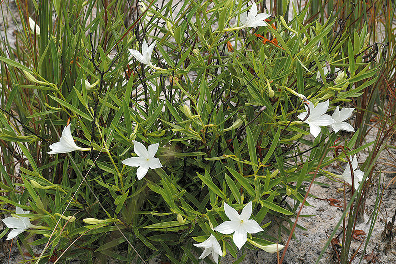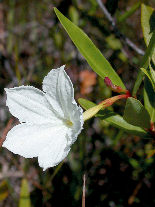 ไม้พุ่ม สูงได้ถึง 2 ม. มีขนละเอียดประปรายตามเส้นกลางใบ ก้านใบ และกลีบเลี้ยงด้านนอก ใบเรียงตรงข้าม รูปรีถึงรูปแถบ ยาว 2.5–8 ซม. ก้านใบยาวประมาณ 5 มม. ช่อดอกสั้นมีดอกเดียวหรือเป็นกระจุก 2–3 ดอก ออกที่ปลายกิ่ง กลีบเลี้ยง 5 กลีบ รูปใบหอก โคนกว้าง ยาวได้ถึง 7 มม. ขอบมีขนครุย มีต่อมด้านใน ดอกรูปลำโพงสีขาว เรียงซ้อนทับด้านขวาในตาดอก หลอดกลีบดอกยาว 1.5–3.5 ซม. ป่องกลาง มี 5 กลีบ บานออก ยาว 0.8–1.5 ซม. เกลี้ยงหรือมีขน เกสรเพศผู้ 5 อัน ติดใกล้โคนหลอดกลีบ ก้านชูอับเรณูสั้น อับเรณูยาวประมาณ 4 มม. จานฐานดอกมี 2 พู ติดระหว่างคาร์เพล ก้านเกสรเพศเมียรูปเส้นด้าย มีขนประปราย ยาวประมาณ 6 มม. ผลแตกแนวเดียวติดกันเป็นคู่ รูปแถบ ยาว 8.5–19 ซม. เมล็ดจำนวนมาก แบน ยาว 0.5–1 ซม. กระจุกขนยาว 1–4 ซม.