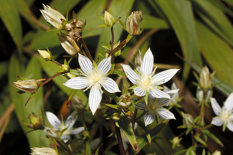 ไม้ล้มลุก สูง 30–60 ซม. ใบรูปขอบขนานหรือรูปใบหอก ยาว 3–4 ซม. ปลายแหลม โคนสอบ ไร้ก้าน กลีบเลี้ยงและกลีบดอกจำนวนอย่างละ 5 กลีบ ก้านดอกยาว 5–10 มม. กลีบเลี้ยงรูปใบหอก ยาว 5–8 มม. ปลายแหลมหรือแหลมยาว ดอกสีขาว มีริ้วยาวสีม่วง กลีบรูปรีหรือรูปขอบขนาน ยาว 0.8–1 ซม. ปลายแหลม ขอบเว้าเล็กน้อย โคนกลีบมีต่อมน้ำต้อย 2 ต่อม มีเกล็ดที่โคน ขอบมีขนยาวประมาณ 2 มม. ยกเว้นปลายต่อม เกสรเพศผู้ 5 อัน ก้านชูอับเรณูยาว 4–5 มม. อับเรณูยาว 1–3 มม. ผลรูปขอบขนาน ยาว 0.7–1 ซม.