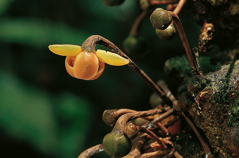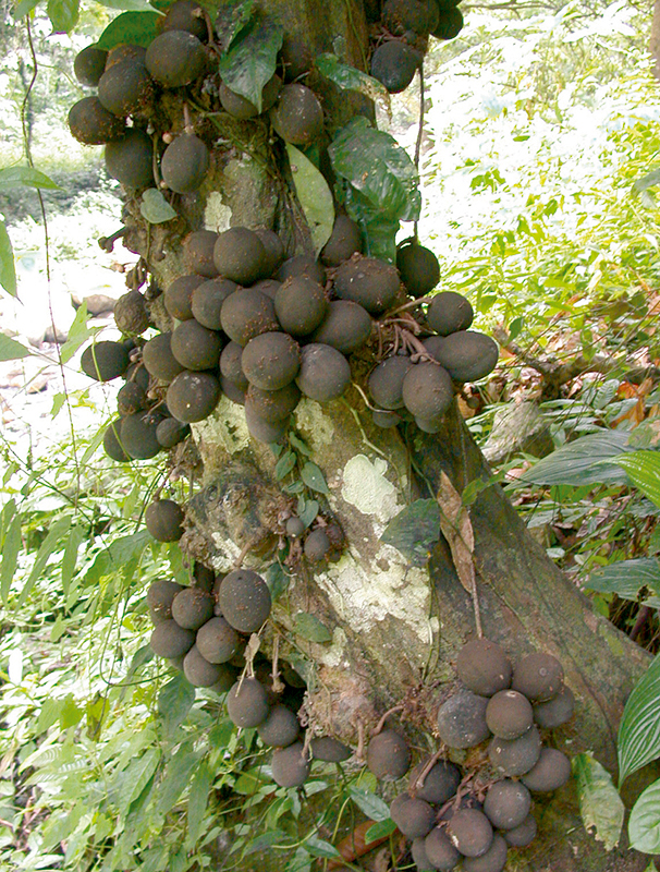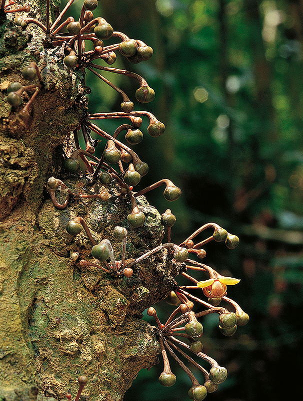 งำเงาะ: ดอกออกเป็นกระจุกตามลำต้น ผลมีขนละเอียดสีน้ำตาลดำ (ภาพ: มานพ ผู้พัฒน์, Simon Gardner)