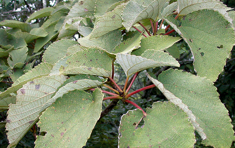 เต้ามด: ใบเรียงเวียนหนาแน่นที่ปลายกิ่ง ขอบใบจักซี่ฟัน แผ่นใบด้านล่างมีขนสีขาว ช่อดอกแบบช่อกระจุกแน่นแยกสองแฉก ออกตามกิ่ง (ภาพ: ราชันย์ ภู่มา)