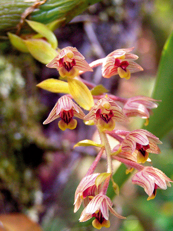 กล้วยไม้อิงอาศัย ลำลูกกล้วยรูปทรงกระบอก ยาว 3.5–14 ซม. ใบรูปขอบขนานถึงรูปแถบ ยาว 10–20 ซม. ก้านใบสั้นหรือยาวได้ถึง 1 ซม. ช่อดอกแบบช่อกระจะ ออกตรงข้ามใบ ยาว 7–12 ซม. มีขนสั้นนุ่มหนาแน่น ก้านช่อยาวประมาณ 2 ซม. ใบประดับรูปขอบขนาน ยาว 0.8–1.3 ซม. มี 6–12 ดอก ก้านดอกยาว 1.5–2 ซม. รวมรังไข่ ดอกสีขาวอมเขียวปนเหลืองอ่อน มีเส้นกลีบสีน้ำตาลแดง กลีบเลี้ยง 3 กลีบ มีขนสีน้ำตาล กลีบบนรูปใบหอก ยาวประมาณ 1 ซม. กลีบข้างรูปไข่ ยาวเท่า ๆ กลีบบน กลีบดอกรูปไข่กลับแกมรูปใบหอก ยาว 8–9 มม. กลีบปากรูปไข่กลับ ยาวประมาณ 8 มม. ปลายแยกเป็น 3 พู รูปไข่ ยาว 3–4 มม. สีเหลืองเข้ม โคนกลีบด้านในสีน้ำตาลแดงเข้ม มีครีบหนาที่โคน เส้าเกสรยาวประมาณ 4 มม. โคนยาวประมาณ 3 มม. ผลแห้งแตก รูปทรงกระบอก ยาวประมาณ 3 ซม. มีขนสีน้ำตาลแดงหนาแน่น