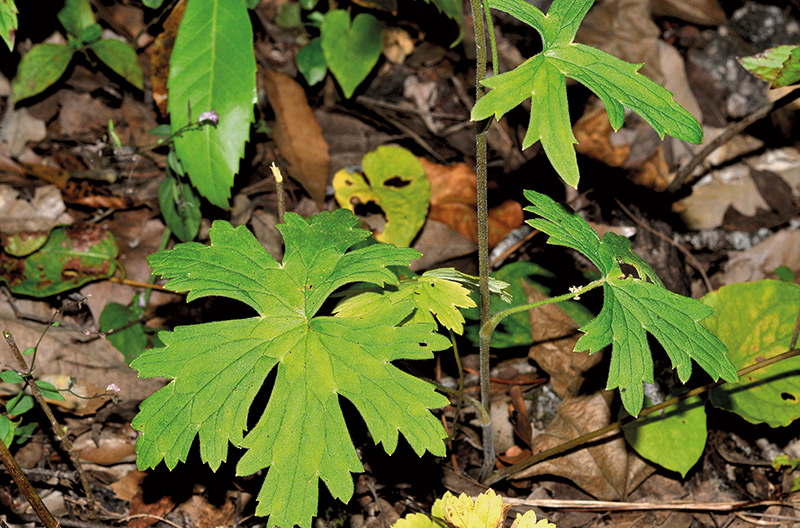 ไม้ล้มลุก สูง 30–150 ซม. มีเหง้า ลำต้นมีขนสั้นนุ่มหนาแน่น ใบรูปห้าเหลี่ยมกว้าง ยาวได้ถึง 25 ซม. มี 3–7 แฉก แต่ละแฉกจัก 3 พู ตื้น ๆ โคนรูปหัวใจ ขอบจักซี่ฟันห่าง ๆ แผ่นใบมีขนสั้นนุ่มกระจายด้านบน มีขนยาวด้านล่าง ใบช่วงล่างก้านใบยาว 10–45 ซม. ช่วงบนไร้ก้าน ช่อดอกแบบช่อกระจะ มี 2–7 ดอก มีขนต่อมยาวม้วนงอ ใบประดับขนาดเล็ก ก้านดอกยาว 1.8–5 ซม. ดอกสีน้ำเงินอมม่วงหรือชมพู สมมาตรด้านข้าง กลีบเลี้ยง 5 กลีบ คล้ายกลีบดอก รูปรี ยาว 1–1.5 ซม. กลีบบนมีเดือยยาว 1.4–1.7 ซม. ด้านนอกมีขนหนาแน่น กลีบดอก 4 กลีบ ขนาดเล็ก ปลายแยก 2 แฉก กลีบคู่บนมีต่อมน้ำต้อย กลีบคู่ล่างมีขนแผงด้านใน ด้านนอกมีขนหยาบ เกสรเพศผู้จำนวนมาก โคนก้านชูอับเรณูแผ่กว้าง ผลกลุ่มแตกแนวเดียว มี 3 ผลย่อย ยาว 1.4–1.6 มม. จะงอยยาวประมาณ 3 มม. มีขนยาวกระจาย เมล็ดขนาดเล็กจำนวนมาก มีครีบเป็นชั้น ๆ