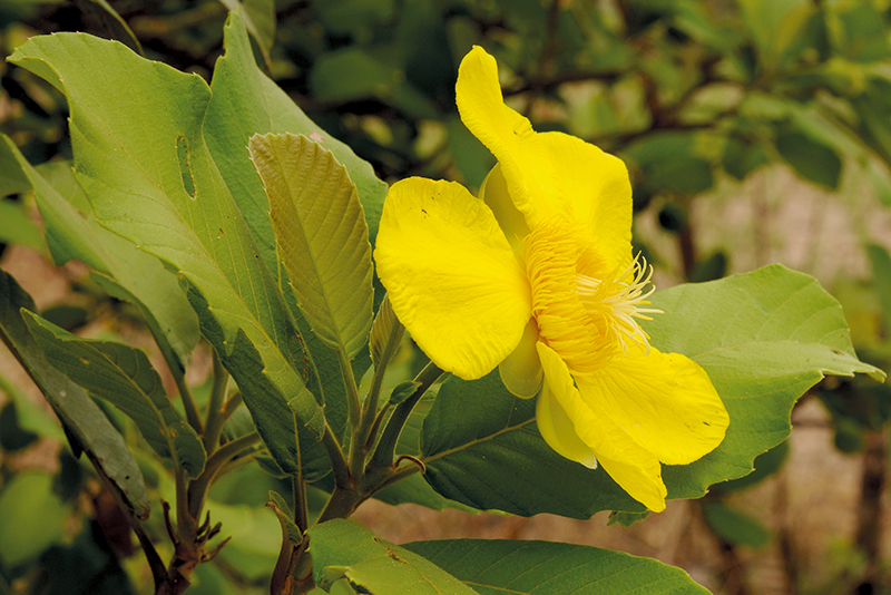 ไม้ต้น ไม่ผลัดใบ สูงได้ถึง 30 ม. ใบรูปรีหรือรูปไข่ ยาว 10–20 ซม. ปลายกลมหรือมน โคนแหลมหรืิอมน ขอบจักซี่ฟันห่าง ๆ เส้นแขนงใบข้างละ 18–25 เส้น ก้านใบยาว 3–4.5 ซม. ดอกออกเดี่ยว ๆ ที่ปลายกิ่ง ก้านดอกยาวประมาณ 1 ซม. ขยายในผล กลีบเลี้ยงรูปไข่ ยาว 2.5–3 ซม. ดอกสีเหลือง กลีบบาง รูปรี ยาวประมาณ 6–7 ซม. เกสรเพศผู้วงนอกยาว 1.5–2 ซม. วงในยาวประมาณ 2.5 ซม. มี 8–12 คาร์เพล ยาว 6–7 มม. ก้านเกสรเพศเมียยาวประมาณ 2 ซม. ผลสดไม่แตก เส้นผ่านศูนย์กลาง 5–6 ซม. รวมกลีบเลี้ยง เมล็ดไม่มีเยื่อหุ้ม