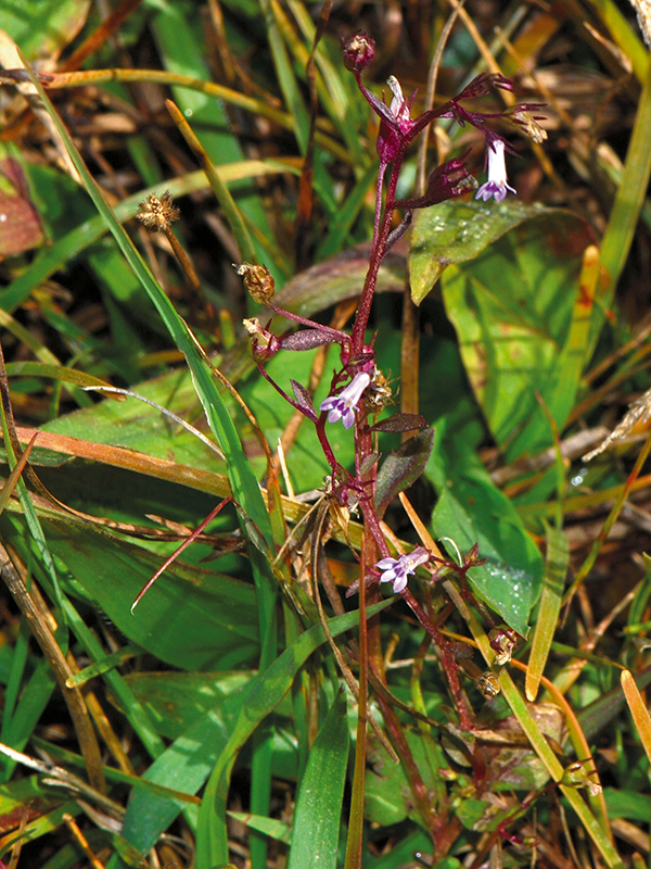 หญ้าผักเบี้ย: L. heyneana ดอกสีม่วงอ่อน ๆ กลีบล่างมีปื้นสีม่วง กลีบเลี้ยงติดทน (ภาพ: Brigitta E.E. Duyfjes)