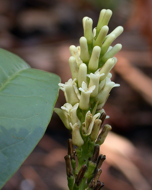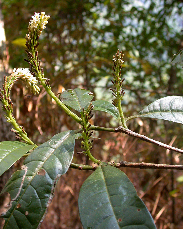 ไม้ต้น สูง 5–15 ม. ใบเรียงตรงข้าม รูปขอบขนานหรือรูปใบหอก ขนาด 3.5–8 x 6.5–18 ซม. ปลายเรียวแหลม โคนรูปลิ่ม ขอบเรียบ แผ่นใบค่อนข้างบาง เส้นแขนงใบข้างละ 10–12 เส้น ก้านใบยาว 1–2.5 ซม. ช่อดอกแบบช่อกระจะ ออกที่ปลายกิ่ง ยาว 5–13 ซม. ดอกย่อยสมบูรณ์เพศ รูปเรียวยาว ขนาดประมาณ 0.2 x 0.8 ซม. ใบประดับย่อย 3 ใบ กลีบเลี้ยงมแยกเป็น 4 แฉก ยาวประมาณ 1 มม. กลีบดอก 4 กลีบ สีขาว รูปลิ่ม ยาว 0.5–0.8 ซม. ค่อนข้างหนา มีขนทั้งสองด้าน เกสรเพศผู้ 4 อัน สั้นกว่ากลีบดอกเล็กน้อย ก้านชูอับเรณูสีเหลืองอ่อน มีขน อับเรณูมี 2–4 พู มีจานฐานดอก รังไข่ใต้วงกลีบ มี 2 คาร์เพล เชื่อมติดกัน ก้านเกสรเพศเมียยาวเท่า ๆ เกสรเพศผู้ ยอดเกสรจักพูเดียว ผลสดรูปรีคล้ายกล้วย ยาวประมาณ 1 ซม. มีเมล็ดเดียว |