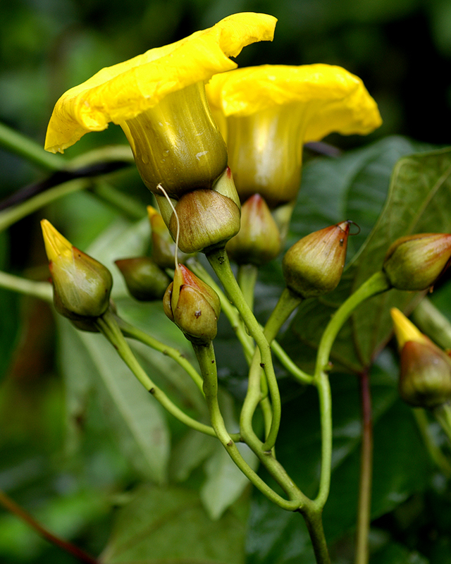 ไม้ล้มลุกเถา อายุหลายปี ยาวได้ถึง 30 ม. ลำต้นเกลี้ยง น้ำยางสีขาว ใบเดี่ยวแบบก้นปิด เรียงเวียน ใบรูปไข่เกือบกลม ยาว 7–30 ซม. ปลายแหลมยาวหรือเป็นติ่งแหลม โคนมนหรือกลม แผ่นใบเกลี้ยง เส้นแขนงใบข้างละ 7–10 เส้น ก้านใบยาวได้ถึง 20 ซม. ช่อดอกแบบช่อเชิงหลั่น ออกตามซอกใบ ยาวได้ถึง 40 ซม. ก้านช่อยาว 5–15 ซม. ใบประดับขนาดเล็ก ร่วงเร็ว ก้านดอกยาว 1.5–2.5 ซม. ปลายก้านหนา ดอกจำนวนมาก กลีบเลี้ยงและกลีบดอกมีจำนวนอย่างละ 5 กลีบ กลีบเลี้ยงยาวเท่า ๆ กัน ปลายมนมีติ่งแหลม กลีบนอก 3 กลีบ รูปไข่ ยาว 1.8–2.5 ซม. กลีบใน 2 กลีบ รูปขอบขนานแกมรูปไข่ ยาวเท่า ๆ กลีบนอกแต่บางกว่า ดอกรูปปากแตร ยาว 4–6 ซม. ปลายแยกเป็นแฉกตื้น ๆ เกสรเพศผู้ 5 อัน ติดระหว่างกลีบดอกในหลอดกลีบ ไม่ยื่นพ้นปากหลอดกลีบ มีขนด้านล่าง ก้านชูอับเรณูรูปเส้นด้าย อับเรณูบิดเป็นเกลียว จานฐานดอกรูปวงแหวน รังไข่ 4 ช่อง เกลี้ยง ก้านเกสรเพศเมียรูปเส้นด้าย ยอดเกสรมี 2 พู ผลแห้งแตกเป็น 4 ส่วน มี 4 เมล็ด รูปคล้ายสามเหลี่ยม ยาว 0.6–0.8 ซม. มีขนยาวสีน้ำตาลเหลืองหนาแน่น |