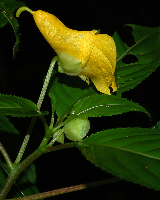ไม้ล้มลุก สูงได้ถึง 50 ซม. ลำต้นเกลี้ยง ใบเรียงเวียน รูปไข่หรือแกมรูปขอบขนาน ยาว 4.5–14 ซม. ปลายแหลมยาว โคนรูปลิ่มกว้าง ขอบจักฟันเลื่อย ปลายจักเป็นติ่ง มีต่อมใกล้โคนเหนือก้านใบ แผ่นใบค่อนข้างบาง เส้นแขนงใบข้างละ 6–8 เส้น ก้านใบยาวได้ถึง 5 ซม. ดอกออกเดี่ยว ๆ หรือเป็นกระจุก 2 ดอก ออกตามซอกใบใกล้ปลายกิ่ง ก้านดอกยาว 3–4 ซม. เกลี้ยง ใบประดับขนาดเล็กติดใกล้โคนก้านดอก ยาวประมาณ 2 มม. กลีบเลี้ยงสีเขียวอ่อน กลีบข้าง 4 กลีบ คู่นอกรูปไข่กว้าง ยาวประมาณ 7 มม. คู่ในขนาดเล็ก รูปรี ยาวประมาณ 1 มม. กลีบปากเป็นถุง ลึก 0.8–1 ซม. ปลายคอดเป็นเดือยสั้น ๆ โค้ง เดือยเต่ง ดอกสีเหลือง มีจุดสีแดงด้านใน กลีบปากรูปไข่กลับกว้าง ยาวประมาณ 8–9 มม. กว้างประมาณ 6 มม. เส้นกลางกลีบเป็นสันที่โคน กลีบปีกติดกัน คู่นอกติดกันประมาณกึ่งหนึ่ง ยาวประมาณ 1.2 ซม. คู่ในยาวเท่า ๆ คู่นอก มีก้านกลีบ ผลแห้งแตก เกลี้ยง |