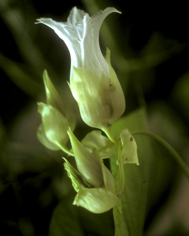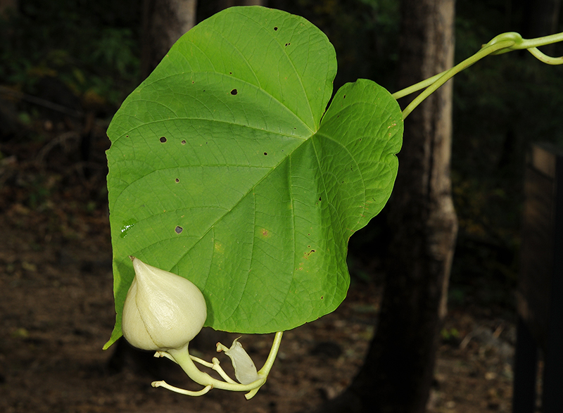 ไม้เถาล้มลุก ยาวได้ถึง 10 ม. ลำต้นเกลี้ยง น้ำยางสีขาว ใบรูปไข่กว้าง ขนาดกว้าง 7–20 ซม. ยาว 9.5–1.5 ซม. ปลายแหลมยาว โคนรูปหัวใจ แผ่นใบบาง มีตุ่มเล็ก ๆ กระจายด้านล่าง เส้นแขนงใบข้างละ 6–9 เส้น เส้นแขนงใบย่อยแบบขั้นบันไดกึ่งร่างแห ก้านใบยาว 3.5–8.5 ซม. ช่อดอกยาว 11–24 ซม. มี 2–4 ดอก ใบประดับรูปไข่กว้าง ยาวได้ถึง 3.3 ซม. ปลายเรียวแหลม ติดทน ก้านดอกยาว 1–2 ซม. ช่วงบนหนา กลีบเลี้ยงขนาดไม่เท่ากัน ขยายในผล คู่นอกรูปไข่กลับแคบ ๆ ยาวได้ประมาณ 4.4 ซม. ปลายเป็นติ่งแหลม 3 กลีบในรูปขอบขนาน ยาวได้ถึง 4 ซม. ปลายแหลม ดอกสีขาว ยาว 7.5–9 ซม. เกลี้ยงด้านนอก มีขนสั้นหนานุ่มด้านในติดโคนก้านชูอับเรณู ปลายกลีบเรียวแหลมคล้ายรูปหัวใจ เหนือจุดแนบติดเกสรเพศผู้มีแผ่นเกล็ดรูปไข่กลับ ขนาดประมาณ 5 x 3.5 มม. ขอบจักเล็กน้อย ก้านชูอับเรณูยาว 2–2.6 ซม. อับเรณูยาว 7–9 มม. บิดเวียน จานฐานดอกสูง 1–2 มม. รังไข่จัก 4 พู สูงประมาณ 2 มม. ก้านเกสรเพศเมียยาว 2.7–3 ซม. เกลี้ยง ผลส่วนใหญ่แยกเป็น 4 กระเปาะ กระเปาะรูปไข่กลับ ขนาด 1–1.3 x 1.5–1.7 ซม. ผนังบางใสครึ่งบน หนาครึ่งล่าง แต่ละกระเปาะมีเมล็ดเดียว รูปไข่ เกลี้ยง สีน้ำตาล ยาว 6–7 มม. มีขั้วกลม ๆ สีเหลืองที่โคน | | | |