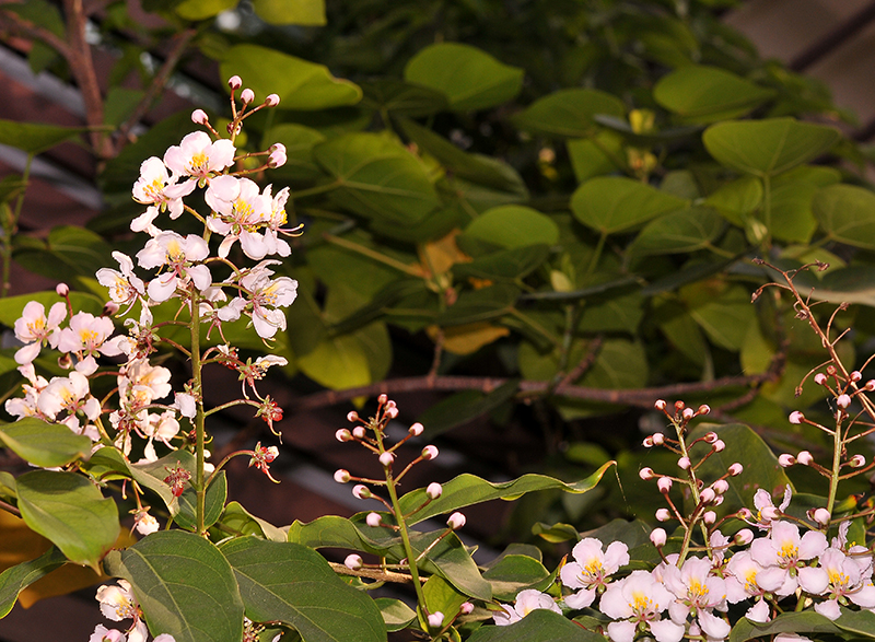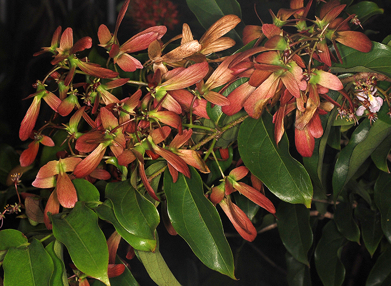 ไม้เถา กิ่งเกลี้ยง มีช่องอากาศหนาแน่น ตามข้อมีขนสีขาวกระจาย ใบเรียงตรงข้าม รูปรีหรือรูปขอบขนาน ยาว 5.5–12 ซม. ปลายแหลมยาว โคนกลม มักมีต่อม 2 ต่อม แผ่นใบด้านล่างมีจุดต่อมตามขอบใบ เส้นแขนงใบข้างละ 4–8 เส้น ก้านใบหนา ยาวประมาณ 5 มม. ช่อดอกแบบช่อกระจะ ออกตามซอกใบหรือปลายกิ่ง ยาวได้ถึง 15 ซม. ก้านช่อยาวประมาณ 2 ซม. ใบประดับรูปสามเหลี่ยม ยาวประมาณ 2 มม. ใบประดับย่อยยาวประมาณ 1 มม. ดอกจำนวนมาก ก้านดอกยาว 1–2.2 ซม. มีข้อต่อประมาณใต้จุดกึ่งกลาง กลีบเลี้ยงรูปไข่ ปลายแหลมหรือมน ยาวประมาณ 2.5 มม. ด้านนอกมีต่อมขนาดเล็กไม่ชัดเจน ดอกสีชมพูอมขาว สมมาตรด้านข้าง กลีบรูปไข่กลับหรือเกือบกลม ขอบจักชายครุย ก้านกลีบยาว 1.5–2.5 มม. เกสรเพศผู้อันยาว 1 อัน ยาว 8–9 มม. อันสั้น ยาว 3–5 มม. อับเรณูยาวประมาณ 1 มม. รังไข่เหนือวงกลีบ จัก 3 พู เส้นผ่านศูนย์กลางประมาณ 2 มม. ก้านเกสรเพศเมียโค้งเข้า ยาวประมาณ 1 ซม. เกลี้ยง ผลแห้งแยก สีน้ำตาลแดงเปลี่ยนเป็นสีน้ำตาล เกลี้ยงหรือมีขนประปราย แต่ละซีกมี 3 ปีก ปีกกลางรูปขอบขนาน ยาว 3–4.5 ซม. ปลายมนหรือเว้าตื้น ๆ ปีกข้างยาว 1.5–2.2 ซม. |