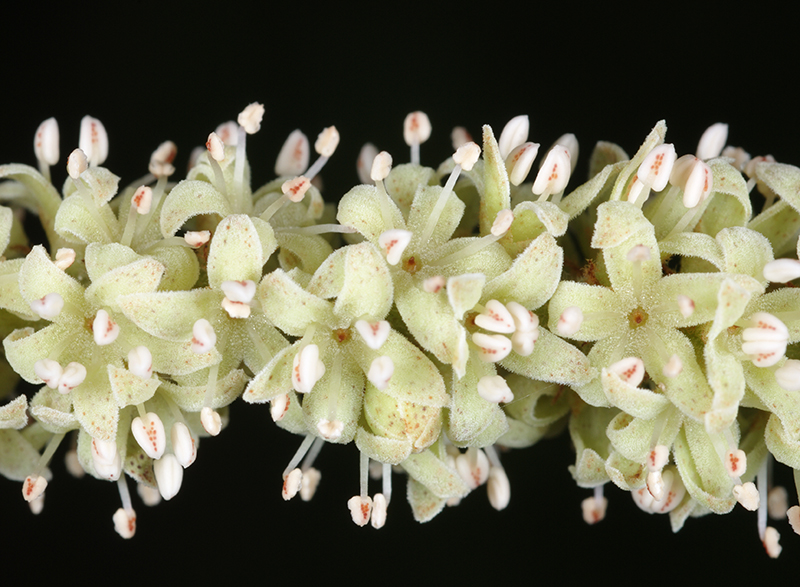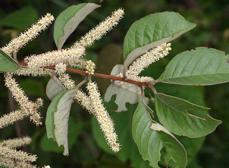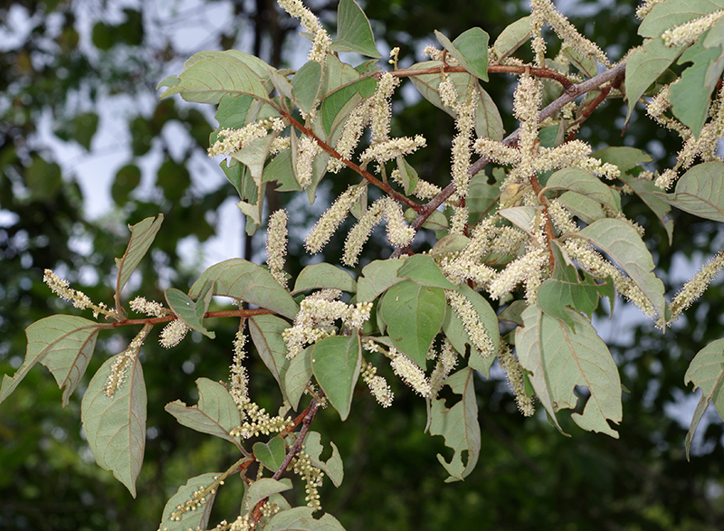 ไม้พุ่มรอเลื้อยหรือตั้งตรง สูงได้ประมาณ 5 ม. มีขนสั้นนุ่มหนาแน่นตามกิ่งอ่อน ก้านใบ แผ่นใบด้านล่าง และช่อดอก กิ่งแก่มีช่องอากาศ ใบเรียงเวียน รูปรีหรือรูปไข่กลับ ยาว 6–15 ซม. ปลายแหลมหรือมน โคนแหลม มน หรือเกือบกลม ขอบใบเรียบหรือจักซี่ฟันตื้นห่าง ๆ เส้นแขนงใบข้างละ 6–8 เส้น ก้านใบยาว 0.5–1.5 ซม. ช่อดอกแบบช่อกระจุก ออกตามซอกใบ ช่อดอกเพศผู้ยาวกว่าช่อดอกเพศเมีย ยาว 4–13 ซม. บางครั้งแยกแขนง ช่อดอกเพศเมีย ยาว 1–7 ซม. ดอกสีเขียวอ่อน ก้านดอกยาว 1.5–2 ซม. กลีบเลี้ยง 4–5 กลีบ แฉกลึก รูปไข่หรือแกมรูปขอบขนาน ยาวประมาณ 1 มม. มีขนและต่อมประปรายด้านนอก ขอบมีขนครุย กลีบดอก 4–5 กลีบ เชื่อมติดกันที่โคน กลีบรูปไข่หรือรูปขอบขนาน ยาวประมาณ 2.5 มม. มีขนประปรายด้านนอก มีปุ่มหนาแน่นด้านใน มีต่อมสีดำกระจาย เกสรเพศผู้เท่าจำนวนกลีบดอก ติดที่โคนกลีบดอก ก้านชูอับเรณูสั้นกว่ากลีบดอกเล็กน้อย อับเรณูรูปไข่ ยาวประมาณ 1 มม. ในดอกเพศเมียเกสรเพศผู้เป็นหมัน ติดประมาณกลางกลีบดอก เกือบไร้ก้าน รังไข่เกลี้ยง ก้านเกสรเพศเมียยาวประมาณ 1 มม. ผลผนังชั้นในแข็ง กลม ๆ เส้นผ่านศูนย์กลางประมาณ 4 มม. มี 1 เมล็ด |
