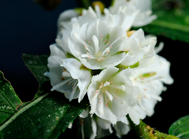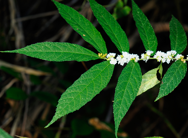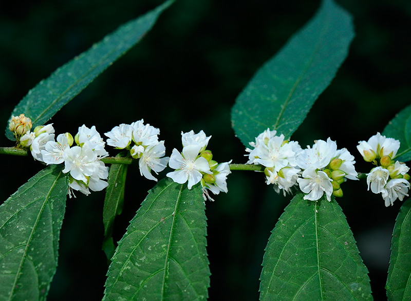 ไม้พุ่ม สูง 3–4 ม. บางครั้งทอดเลื้อย กิ่งอ่อนมีขนสั้นนุ่ม หูใบรูปเส้นด้าย ยาวได้ถึง 7 มม. ร่วงเร็ว ใบเรียงสลับในระนาบเดียวกัน รูปใบหอก ยาว 6–14 ซม. ปลายแหลมยาวหรือยาวเป็นติ่งแหลม โคนมน กลม มักเบี้ยว แผ่นใบมีขนประปราย ขอบใบจักซี่ฟันชั้นเดียวหรือ 2 ชั้น เส้นแขนงใบข้างละ 5–7 เส้น เรียงเกือบจรดขอบใบ เส้นโคนใบ 3 เส้น ก้านใบพอง ยาวประมาณ 4–5 มม. ดอกออกเป็นช่อกระจุกสั้น ๆ ตามซอกใบ มี 3–7 ดอก ก้านดอกสั้น ยาวได้ประมาณ 5 มม. ริ้วประดับ 2–3 อัน ติดที่ข้อเหนือจุดกึ่งกลางก้านดอก ยาวประมาณ 2 มม. กลีบเลี้ยง 5 กลีบ รูปรีหรือรูปขอบขนาน ยาวประมาณ 5 มม. ปลายแหลม กลีบดอกสีขาว 5 กลีบ ติดระหว่างกลีบเลี้ยง เกือบสมมาตร กลีบรูปสามเหลี่ยมกลับ ยาว 0.5–1 ซม. โคนเรียวแคบ ปลายตัดไม่เป็นระเบียบ เกสรเพศผู้แยก 5 กลุ่ม ๆ ละ 3 อัน สั้นกว่าเกสรเพศผู้ที่เป็นหมัน ก้านชูอับเรณูเชื่อมติดกันที่โคน เกสรเพศผู้ที่เป็นหมันรูปลิ้น ติดระหว่างกลุ่มเกสรเพศผู้ สั้นกว่าหรือยาวเท่า ๆ กลีบดอก รังไข่รูปไข่กลับ มีขน ก้านเกสรเพศเมียยาวเท่า ๆ เกสรเพศผู้ที่เป็นหมัน ยอดเกสรหยักเป็นพูแคบ ๆ 5 พู แคปซูลรูปไข่ มี 5 ซีก | | | |
