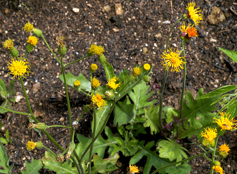 ไม้ล้มลุก อวบน้ำเล็กน้อย รากอ้วน ลำต้นสั้น ใบเรียงเป็นกระจุก ใบรูปรี รูปไข่กลับ หรือรูปใบพาย เรียบหรือแฉกลึก ยาว 5–18 ซม. ปลายมน โคนเรียวสอบ แผ่นใบมีขนสั้นนุ่มประปราย ด้านล่างมักมีสีม่วงแซม ก้านใบยาวได้ถึง 3 ซม. ช่อดอกแบบช่อกระจุกบนช่อแบบช่อเชิงหลั่น ก้านช่อโดดยาว 20–80 ซม. ช่อกระจุกแน่นเส้นผ่านศูนย์กลาง 1–1.5 ซม. ใบประดับ 1–2 อัน รูปแถบ มีขนสั้นนุ่ม วงใบประดับรูปถ้วย ยาว 1–1.2 ซม. ริ้วประดับมีใบประดับ 6–9 อัน วงใบประดับย่อย 13–15 อัน เรียงแถวเดียว ยาว 0.7–1.2 ซม. ดอกสีเหลืองหรือส้ม ยาวประมาณ 1.5 ซม. หลอดกลีบเรียวยาว กลีบรูปสามเหลี่ยม ปลายมน ยาวประมาณ 1 มม. เกสรเพศผู้ 5 อัน ก้านเกสรเพศเมียแตกแขนง ปลายเป็นตุ่ม ผลสีน้ำตาลแดง รูปทรงกระบอก ยาว 3–4 มม. มี 10 ริ้ว แพบพัสจำนวนมาก สีขาว ยาว 1–1.2 ซม. มีขนคล้ายไหม ร่วงง่าย |
