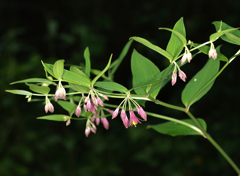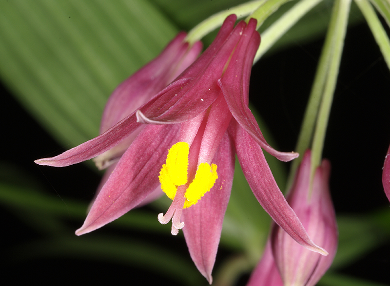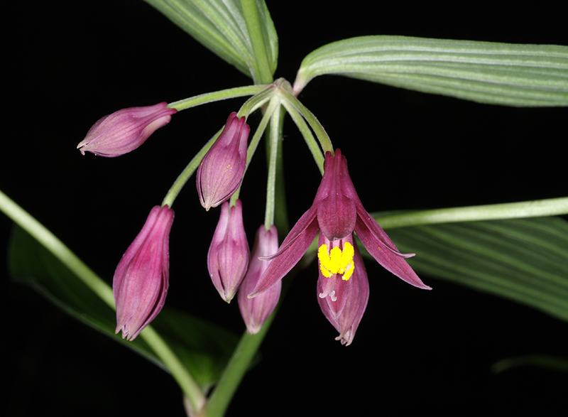 ไม้ล้มลุกอายุหลายปี สูง 30–100 ซม. มีเหง้า รากสด ลำต้นแตกกิ่ง ใบเรียงเวียน รูปรี รูปขอบขนาน หรือแกมรูปไข่ ยาว 5–8 ซม. ปลายแหลมยาว โคนมนหรือกลม เส้นแขนงใบเรียวขนานกัน 3–7 เส้น ก้านใบยาว 3–5 มม. ช่อดอกแบบช่อซี่ร่ม ออกตามกิ่งด้านข้างตรงข้ามใบ มี 3–10 ดอก ในแต่ละช่อ ก้านช่อสั้น ก้านดอกยาว 1–2 ซม. มีริ้วและปุ่มกระจาย ดอกคล้ายรูประฆัง สีชมพูอมแดงหรือม่วง กลีบรวม 6 กลีบ แยกกัน รูปใบหอกกลับ ยาว 1.2–2 ซม. โคนมีเดือย รูปทรงกระบอก ตรงหรือโค้งเล็กน้อย ยาว 4–8 มม. เกสรเพศผู้ 6 อัน ติดที่โคนกลีบรวม ยาว 1–1.8 ซม. ก้านชูอับเรณูแบน ๆ ยาว 0.7–1.3 ซม. อับเรณูยาว 4–5 มม. รังไข่มี 3 ช่อง ยาวประมาณ 3 มม. ก้านแกสรเพศเมียเรียวยาว ยาว 5–9 มม. แยก 3 แฉก บานออก ผลสด กลม เส้นผ่านศูนย์กลางประมาณ 1 ซม. สุกสีดำ ส่วนมากมี 2 เมล็ด | | | |