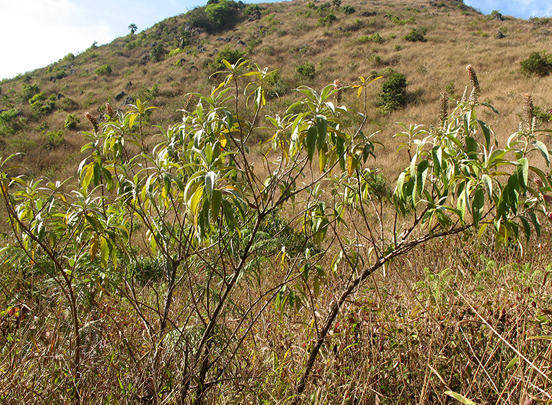 ไม้พุ่มหรือไม้ต้นขนาดเล็ก สูงได้ประมาณ 5 ม. กิ่งเป็นสี่เหลี่ยมหรือมีปีก มีขนคล้ายรูปดาวตามกิ่งอ่อน แผ่นใบ กลีบเลี้ยงและหลอดกลีบดอกด้านนอก รังไข่ และผล หูใบคล้ายใบ ใบเรียงตรงข้าม รูปขอบขนานหรือรูปใบหอก ยาว 4–45 ซม. ปลายแหลมยาว โคนรูปลิ่มหรือเรียวสอบจรดลำต้น ขอบใบจักมน เส้นแขนงใบข้างละ 15–25 เส้น ไร้ก้านหรือเกือบไร้ก้าน ช่อดอกแบบช่อเชิงลด ออกที่ปลายกิ่ง ยาว 5–20 ซม. เรียงหนาแน่น เป็นกระจุก 1–3 ดอก ไร้ก้าน กลีบเลี้ยงรูประฆัง ยาว 3–6 มม. ปลายแยกเป็น 4 กลีบ รูปสามเหลี่ยม ยาวประมาณ 2 มม. ติดทน ดอกสีชมพูอมม่วง เชื่อมติดกันเป็นหลอด ปากหลอดกลีบสีส้ม หลอดกลีบรูปทรงกระบอกแคบ ๆ ยาว 0.8–1 ซม. มีขนยาวด้านใน ปลายแยกเป็น 4 กลีบ เรียงซ้อนเหลื่อมกันเล็กน้อย กลีบเกือบกลม ยาว 2–4 มม. เกสรเพศผู้ 4 อัน ติดใต้ปากหลอดกลีบดอก ก้านชูอับเรณูสั้นมาก อับเรณูยาวประมาณ 2 มม. โคนแฉกลึกรูปหัวใจ รังไข่เหนือวงกลีบ รูปรี ยาว 2–4 มม. มีขนรูปดาวสั้นนุ่ม มี 2–4 ช่อง ออวุลจำนวนมาก ก้านเกสรเพศเมีย 1 อัน ยาว 0.5–3 มม. ยอดเกสรรูปคล้ายกระบอง ผลแห้งแตก รูปรี ยาว 0.7–1 ซม. เมล็ดสีน้ำตาลอ่อน ยาวประมาณ 3 มม. มีปีกที่ปลายทั้งสองข้าง | | | |