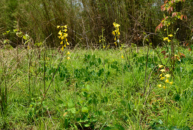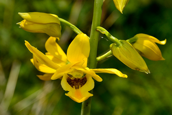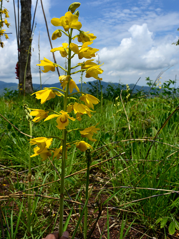 กล้วยดิน ลำต้นใต้ดินรูปไข่เบี้ยว ๆ ยาว 3–8 ซม. ใบและช่อดอกเจริญด้านข้าง ออกพร้อมกัน มี 2–4 ใบ โคนหนาคล้ายก้านใบ ยาว 12–30 ซม. แผ่นใบพับจีบ รูปขอบขนานหรือรูปใบหอก ยาว 25–50 ซม. ช่อดอกแบบช่อกระจะ ตั้งขึ้น ยาวได้ถึง 170 ซม. ก้านช่อยาวได้ถึง 70 ซม. ใบประดับสั้นกว่ารังไข่ ดอกพลิกกลับ เรียงห่าง ๆ สีเหลือง มีจุดสีม่วงที่โคนด้านในถุงกลีบปาก กลีบเลี้ยง 3 กลีบ แยกกัน รูปรี กลีบกลางยาวประมาณ 3.5 ซม. กลีบคู่ข้างเบี้ยว ขนาดใหญ่กว่าเล็กน้อย กลีบดอก 3 กลีบ แยกกัน กลีบคู่ข้างรูปไข่กลับ ปลายกลม ยาวประมาณ 2.9 ซม. กลีบปากรูปรีกว้างเกือบกลม ยาวประมาณ 3 ซม. จัก 3 พู โคนห่อคล้ายถุง พูกลางรูปใบพาย กลางกลีบมีสันนูนขรุขระ 3 สัน เส้าเกสรเกลี้ยง ยาว 1.6–1.7 ซม. โคนสั้น ไม่มีคาง ปลายอับเรณูมีเขาขนาดเล็ก 2 อัน กลุ่มอับเรณู 2 กลุ่ม แข็ง จะงอยรูปแถบ มีแป้นเหนียวเป็นเส้นยาว รังไข่รวมก้านดอกยาว 3–4 ซม. ผลแห้งแตกตามยาว |
