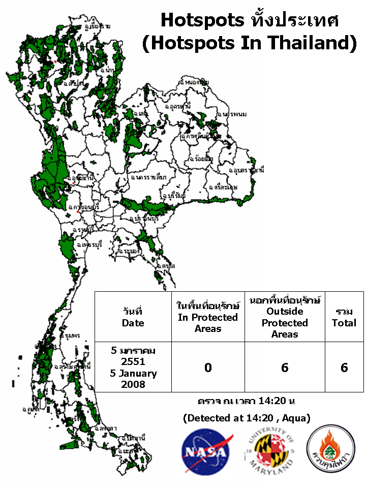 แผนที่แสดงจุดที่ดาวเทียมตรวจพบความร้อนซึ่งมีโอกาสเป็นบริเวณที่เกิดไฟไหม้ (Hotspots) จากดาวเทียม Terra หรือ Aqua MODIS (Thailand Daily Hotspots Maps from Terra or Aqua MODIS)