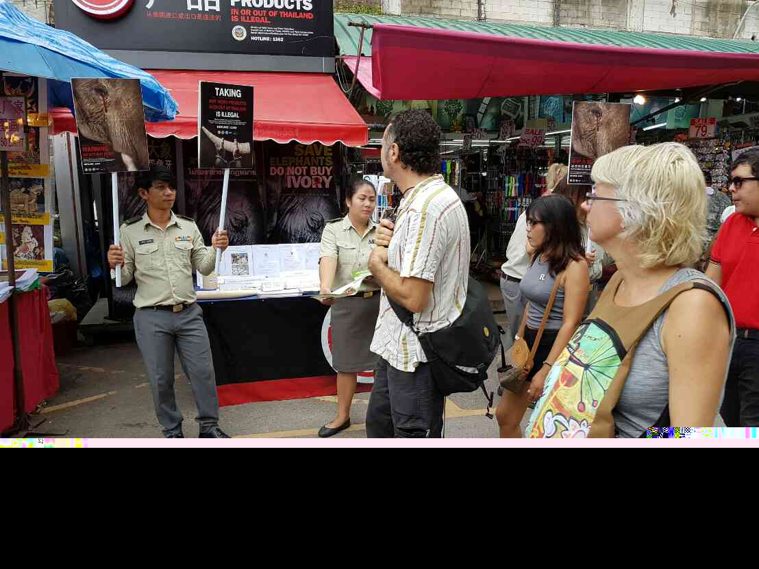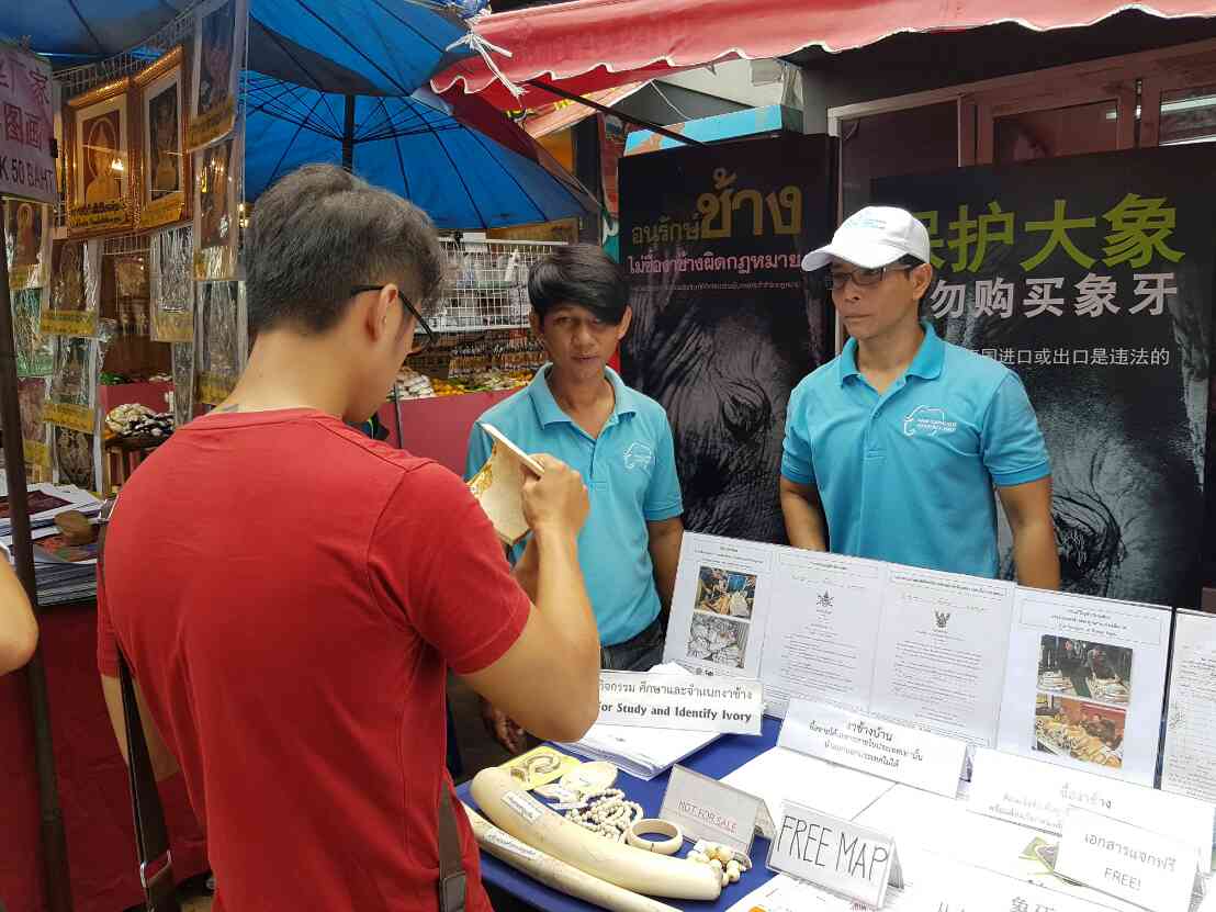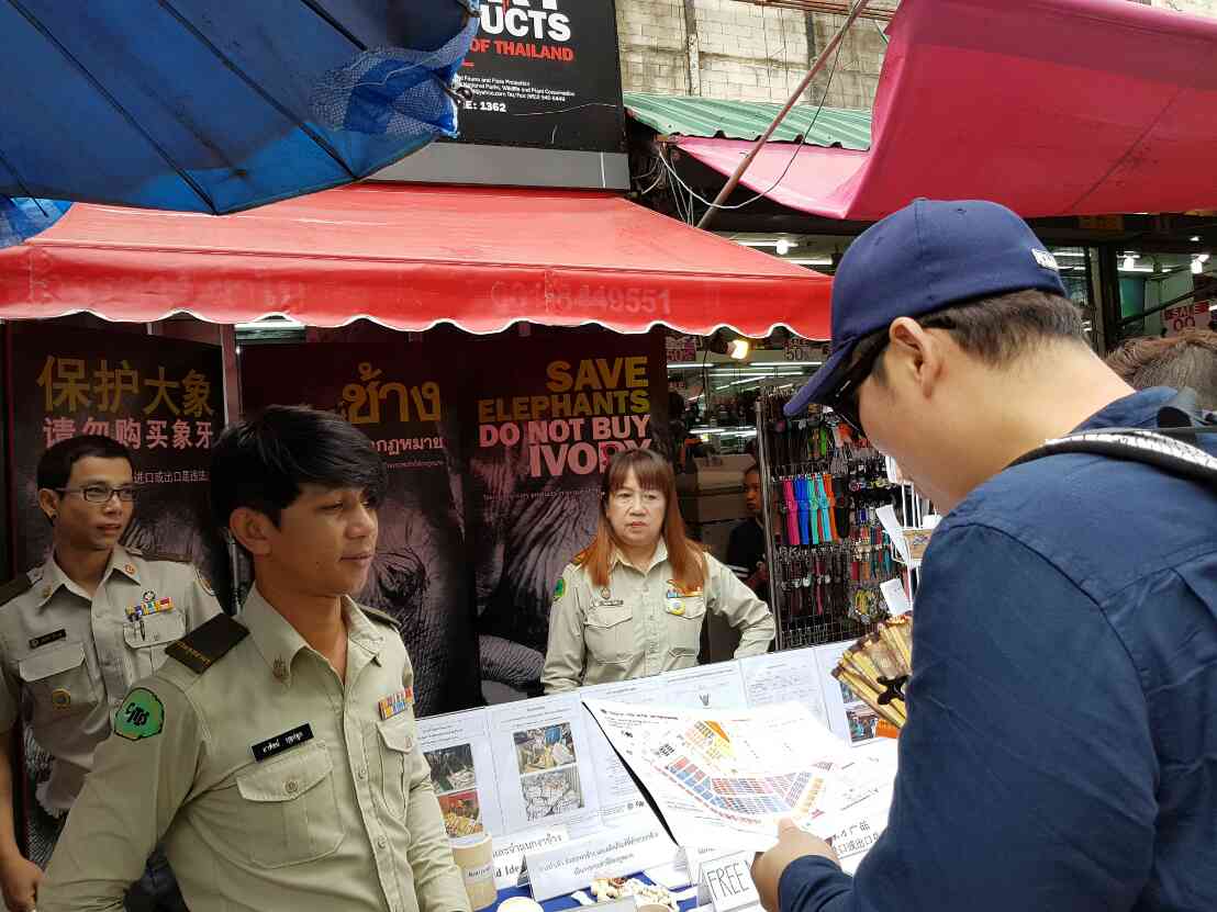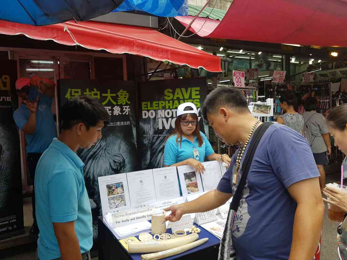 เจ้าหน้าที่กรมอุทยานแห่ชาติ สัตว์ป่าและพันธุ์พืช ร่วมกับเจ้าหน้าที่ตำรวจ บก.ปทส. รณรงค์ประชาสัมพันธ์ ไม่ให้นักท่องเที่ยวชาวต่างชาติซื้องาช้างจากประเทศไทย และร่วมตรวจร้านค้างาช้าง ที่ตลาดนัดจตุจักร กทม. ทุกอาทิตย์ |