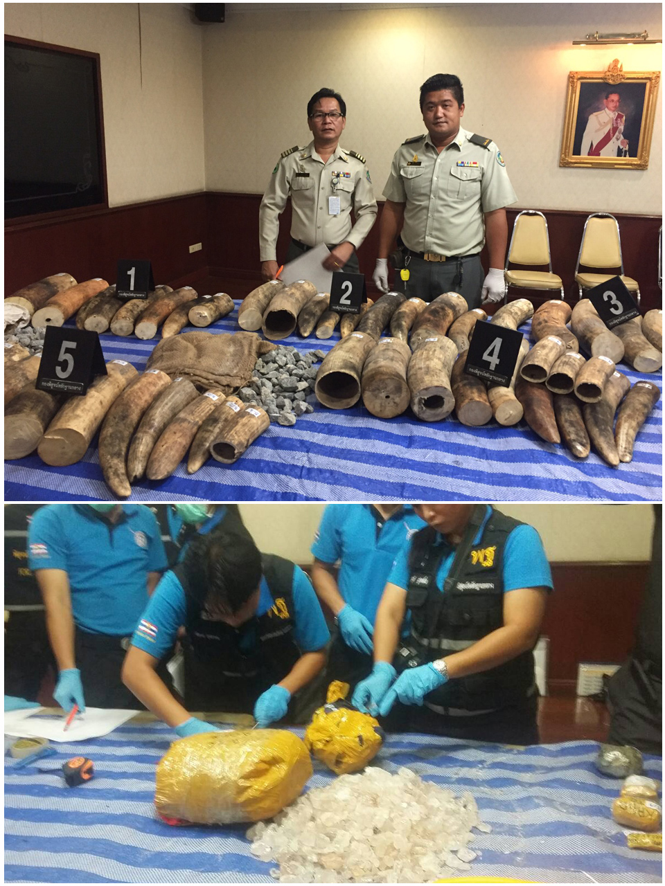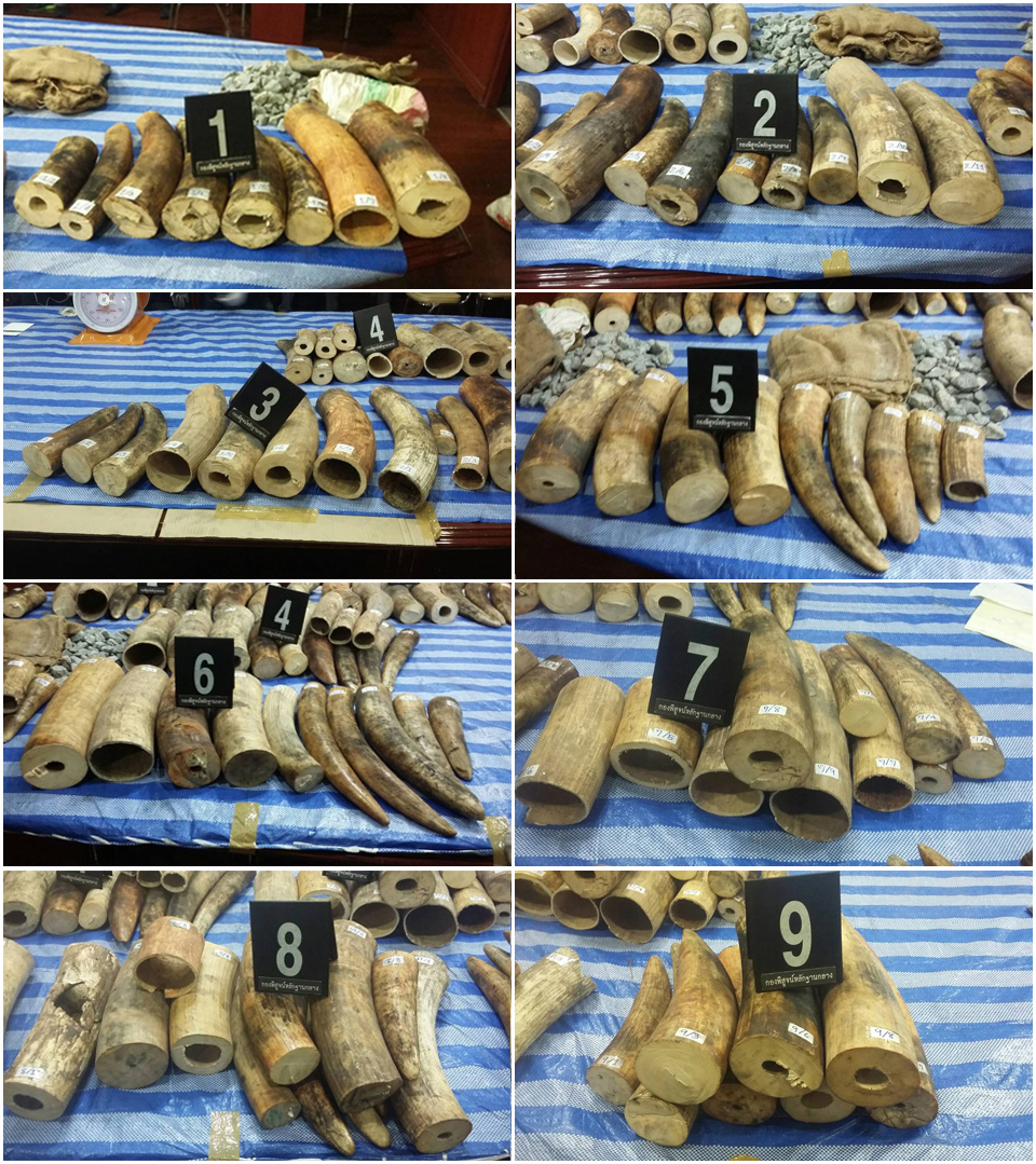 วันที่ 4 เม.ย. 2559 ด่านตรวจสัตว์ป่าท่าอากาศยานสุวรรณภูมิ ศุลกากร เจ้าหน้าที่ตรวจพิสูจน์หลักฐาน สำนักงานตำรวจแห่งชาติ ร่วมตรวจพิสูจน์งาช้างนำเข้ามาจากเคนย่า ต่อลำที่โมซัมบิคถึงกรุงเทพฯ สำแดงเป็นพลอยหลากชนิด พบเป็นงาช้าง จำนวน 87 ท่อน น้ำหนัก 315 กิโลกรัม และพลอยไม่เจียรไน จำนวน 92 กิโลกรัม ภัคพงศ์ ผาทอง รายงาน |