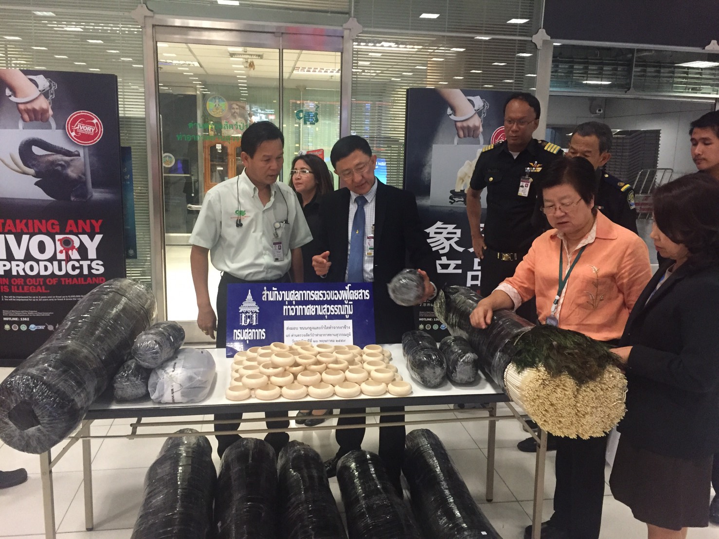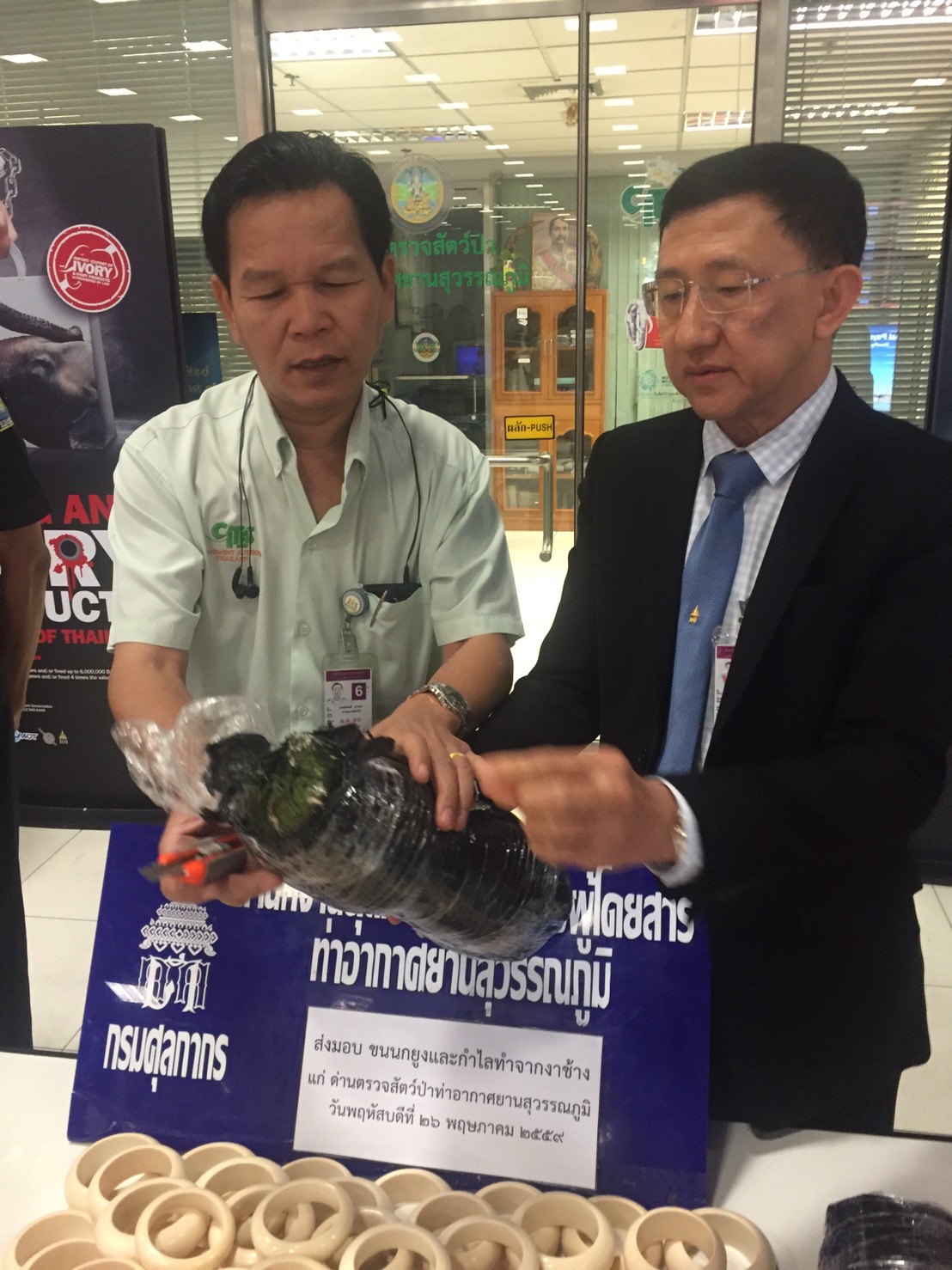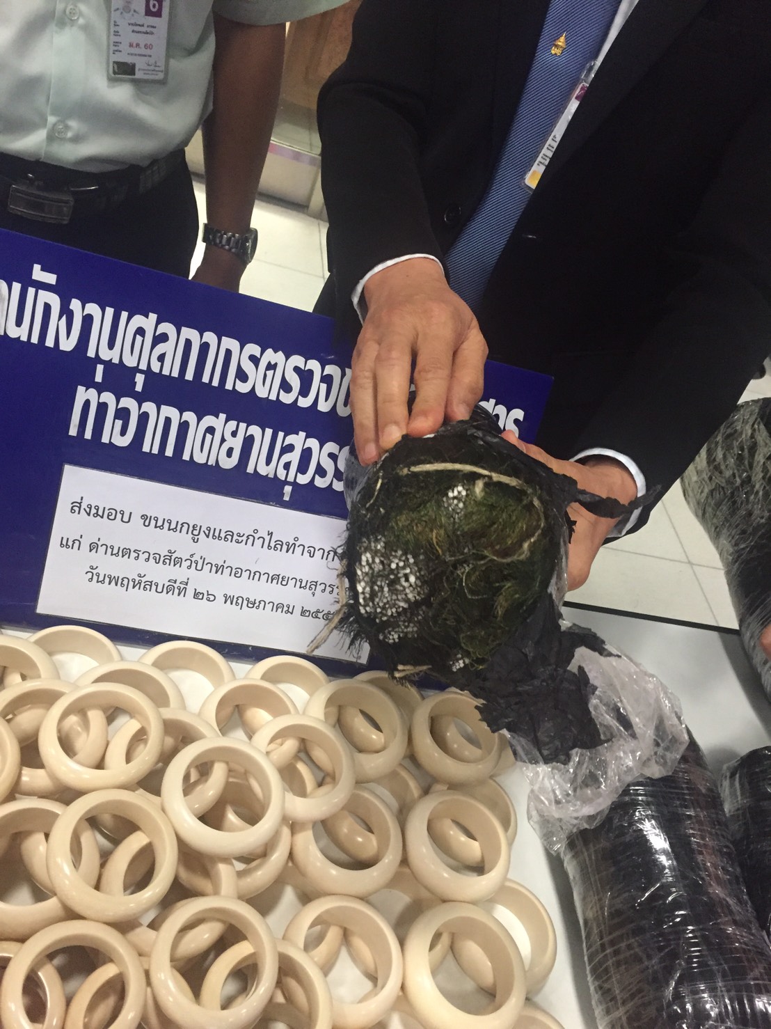 วันที่ 11 ก.พ. 2559 ด่านตรวจสัตว์ป่าท่าอากาศยานสุวรรณภูมิ ตรวจสอบผลิตภัณฑ์สินค้าคล้ายงาช้าง จำนวน 3 ชิ้น และต้องส่งตรวจพิสูจน์ต่อที่กรม ฯ กลุ่มงานวิจัยสัตว์ป่า เพื่อรับรองและตรวจสอบว่างาแท้หรือเทียม |