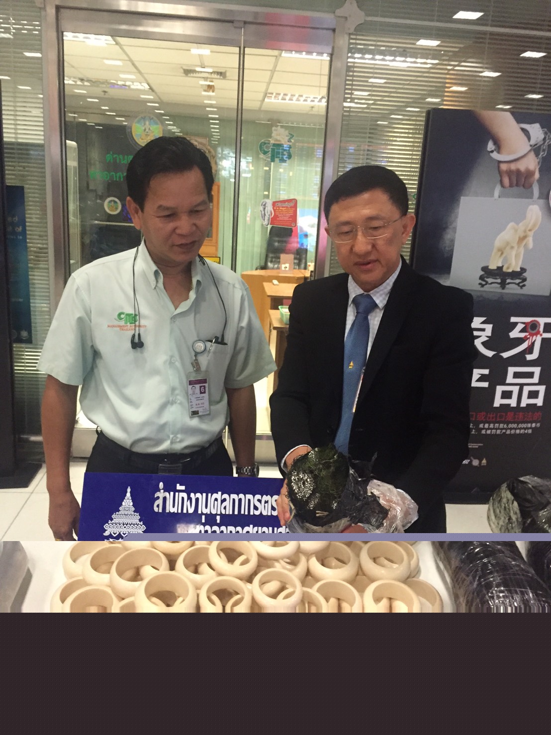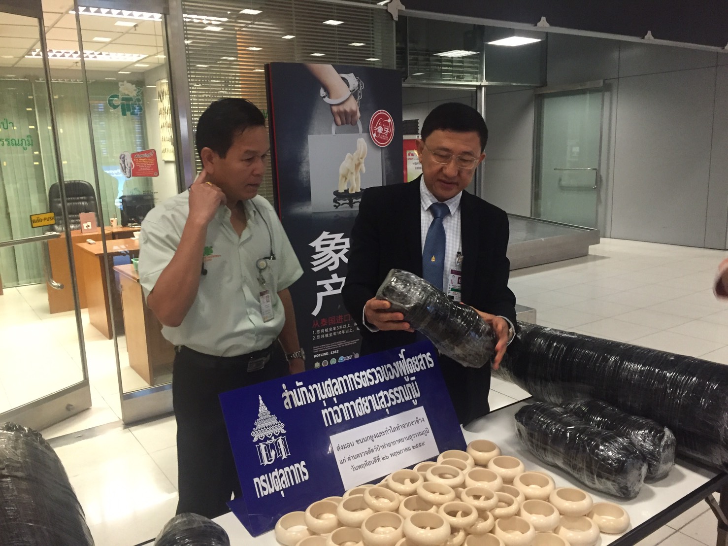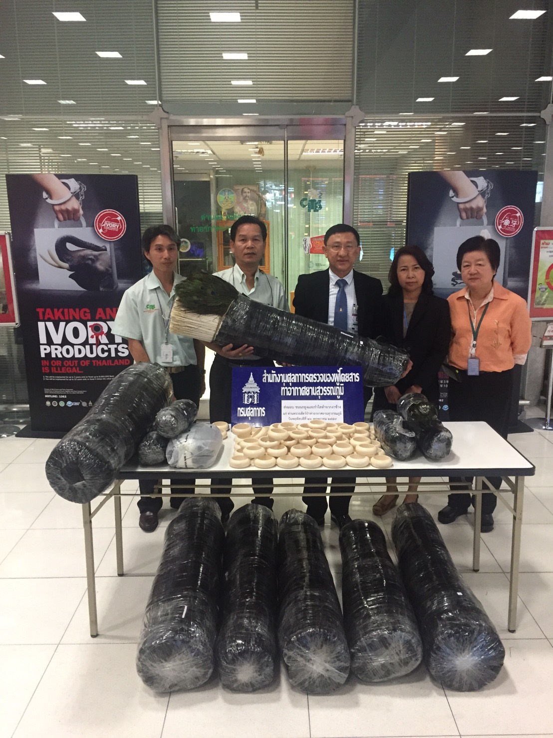 วันที่ 11 ก.พ. 2559 ด่านตรวจสัตว์ป่าท่าอากาศยานสุวรรณภูมิ ตรวจสอบผลิตภัณฑ์สินค้าคล้ายงาช้าง จำนวน 3 ชิ้น และต้องส่งตรวจพิสูจน์ต่อที่กรม ฯ กลุ่มงานวิจัยสัตว์ป่า เพื่อรับรองและตรวจสอบว่างาแท้หรือเทียม |