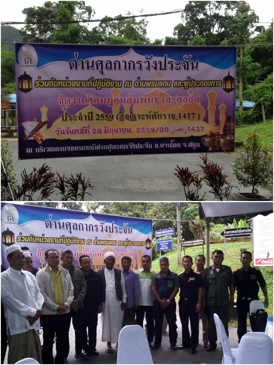 ด่านตรวจสัตว์ป่าวังประจัน ร่วมงานรอมฎอนสัมพันธ์ (ละศีลอด) ประจำปี 2559 ของด่านศุลกากรวังประจัน และหน่วยงานปฏิบัติ มีนายด่านศุลกากร ,นายอำเภอควนโดน ,หัวหน้าส่วนราชการ เจ้าหน้าที่ด่านชายแดนประเทศมาเลเซีย ,โต๊ะอิหม่าม ,ผู้นำทางศาสนาในพื้นที และชาวบ้านเข้าร่วมงานจำนวนมาก |