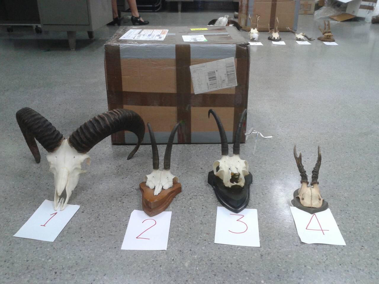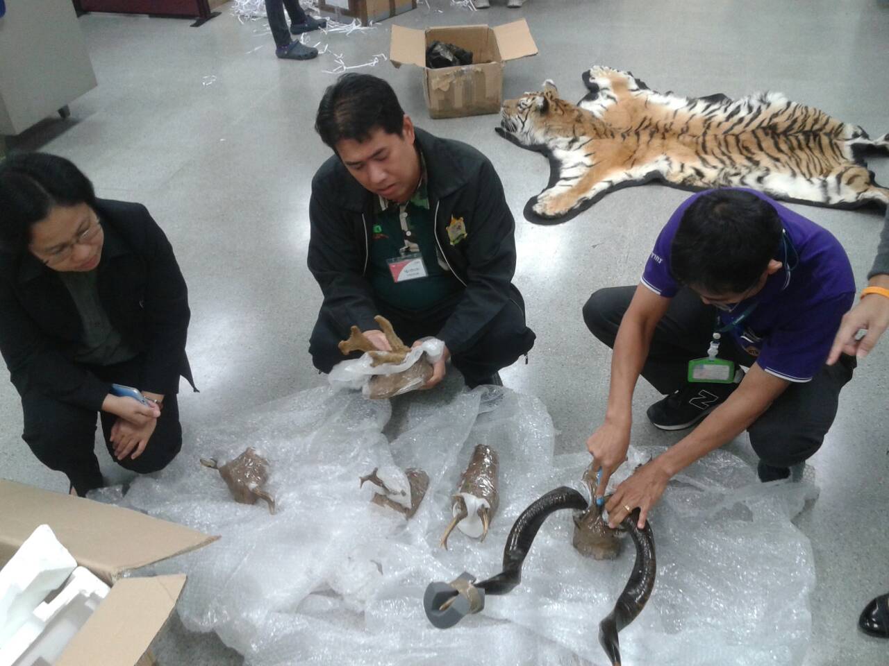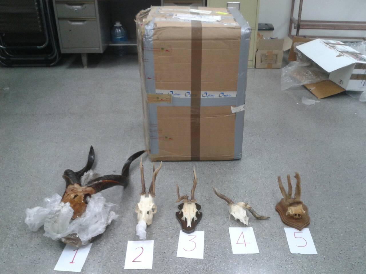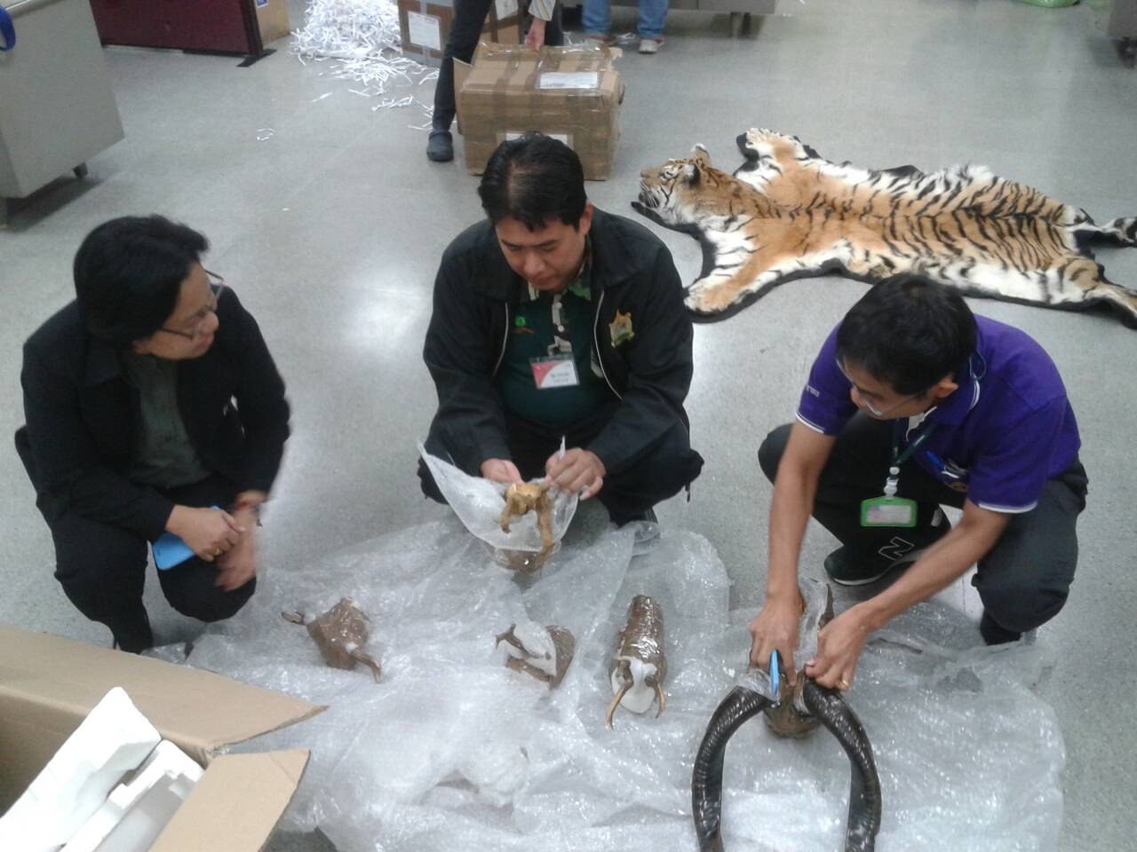 วันนี้ 11 ก.พ.59 ด่านตรวจสัตว์ป่าอากาศยานดอนเมือง ร่วมกับเจ้าหน้าที่ศุลกากร และผู้เชี่ยวชาญตรวจพิสูจน์ สินค้าหนังเสือและเขากวาง ที่ศูนย์ไปรษณีย์กลาง สินค้านำเข้ามาจากฝรั่งเศส จำนวน 10 รายการ |