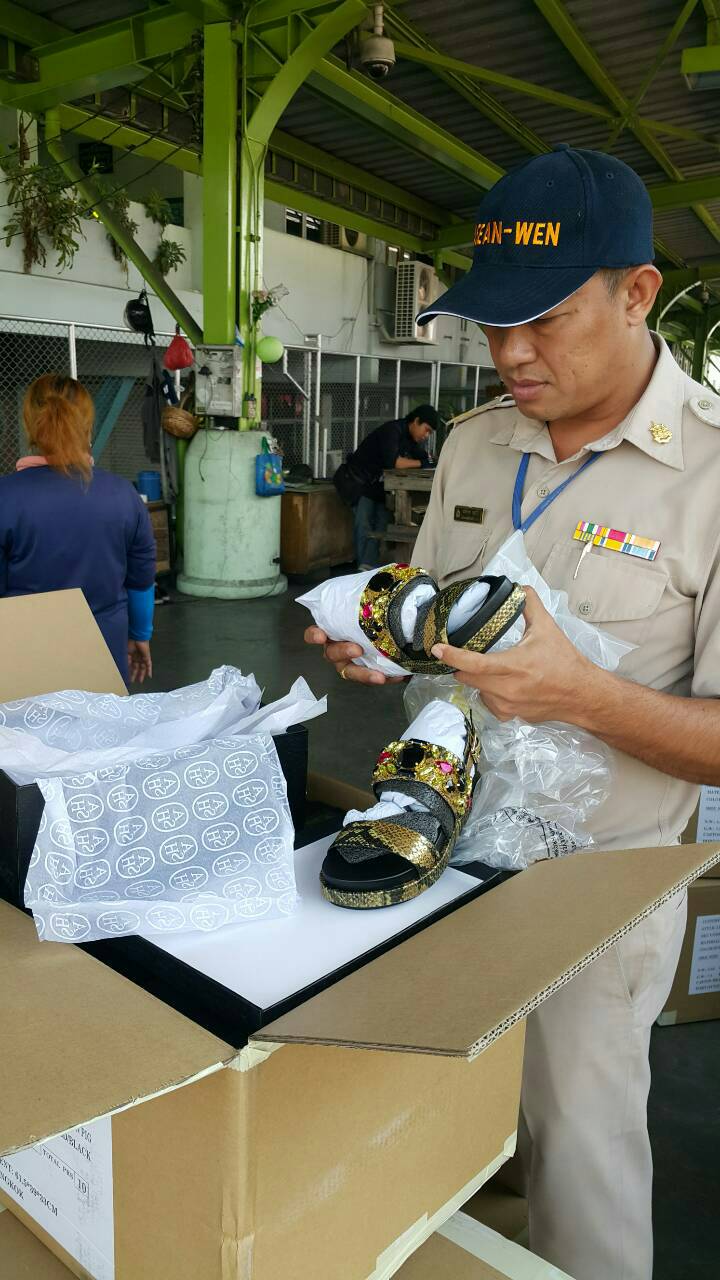 วันที่ 9 กุมภาพันธ์ 2559 ด่านตรวจสัตว์ป่าท่าเรือกรุงเทพ ส่งรายงานการตรวจสินค้า รองเท้าหนังงู king rat snake นำเข้าครับ |